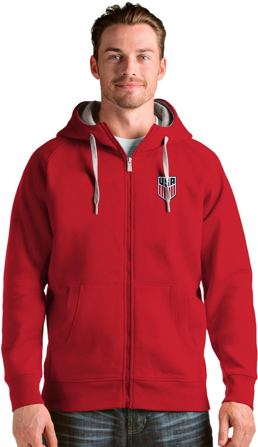 Stay warm wearing the Antigua Women's USA Victory Full-Zip Hoodie. This hoodie is made from 52% cotton and 48% polyester jersey fleece material for all-day comfort. The ribbed hem and cuffs and hood with drawstring provide added warmth.