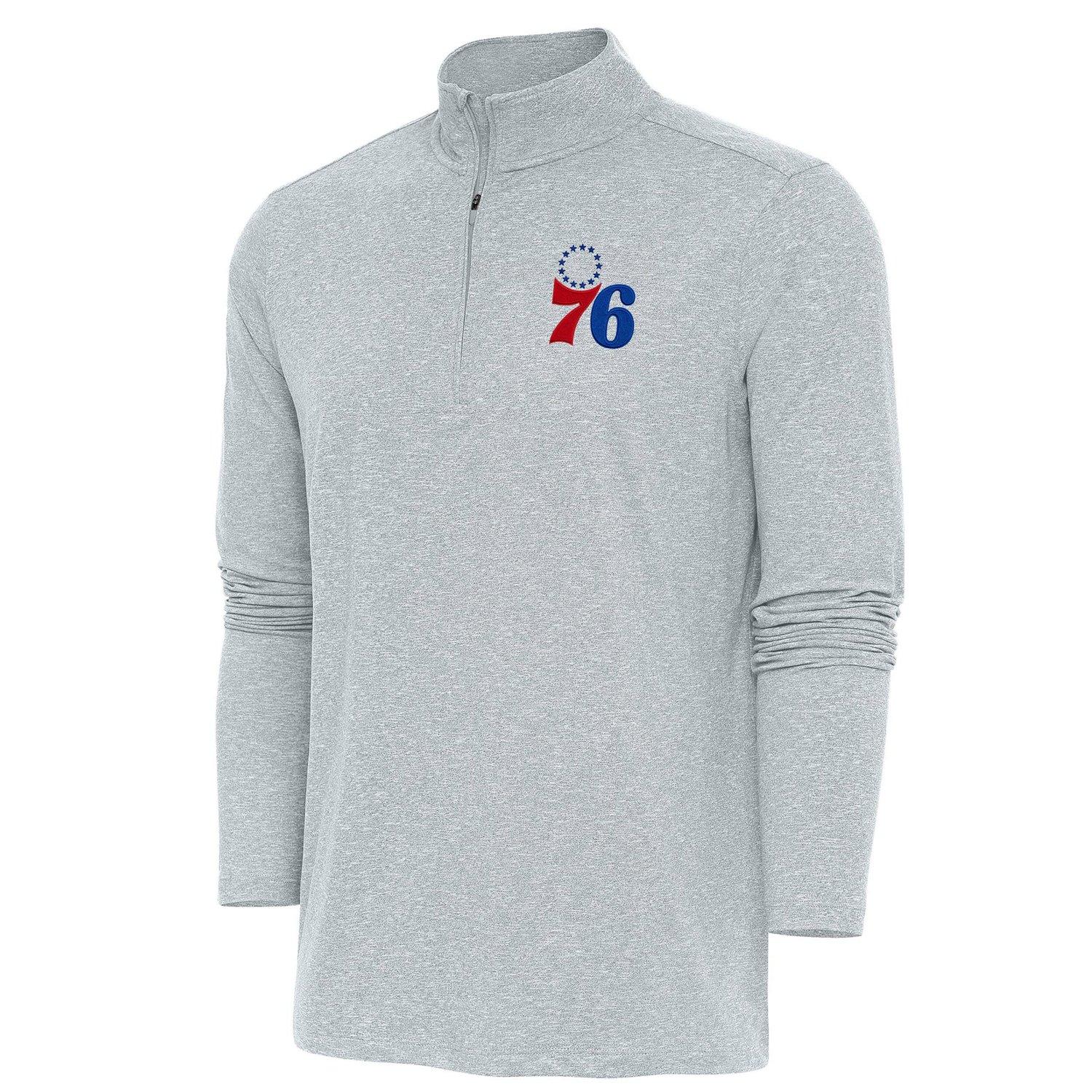 Elevate your Philadelphia 76ers style with this Antigua Heather Gray Hunk Quarter-Zip Pullover Top This lightweight pullover is perfect for mild temperatures and features embroidered Philadelphia 76ers graphics Whether you're on the court or just watching from home this pullover will keep you comfortable and stylish while you cheer on the Philadelphia 76ers