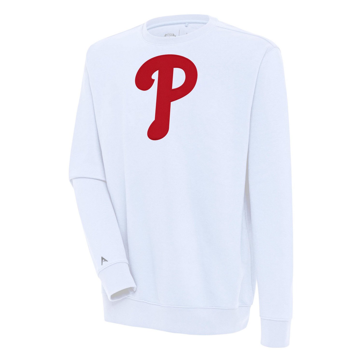 The Men's Antigua White Philadelphia Phillies Victory Pullover Sweatshirt is the perfect way to show your support for the Philadelphia Phillies Made from a soft and comfortable cotton and polyester blend this lightweight sweatshirt is perfect for moderate temperatures Embroidered graphics and 2" x 2" rib detail at the collar cuff and hem add a touch of style while the forward roll shoulder seam provides a comfortable fit Whether you're cheering on the Phillies at the stadium or relaxing at home this sweatshirt is sure to keep you warm and stylish