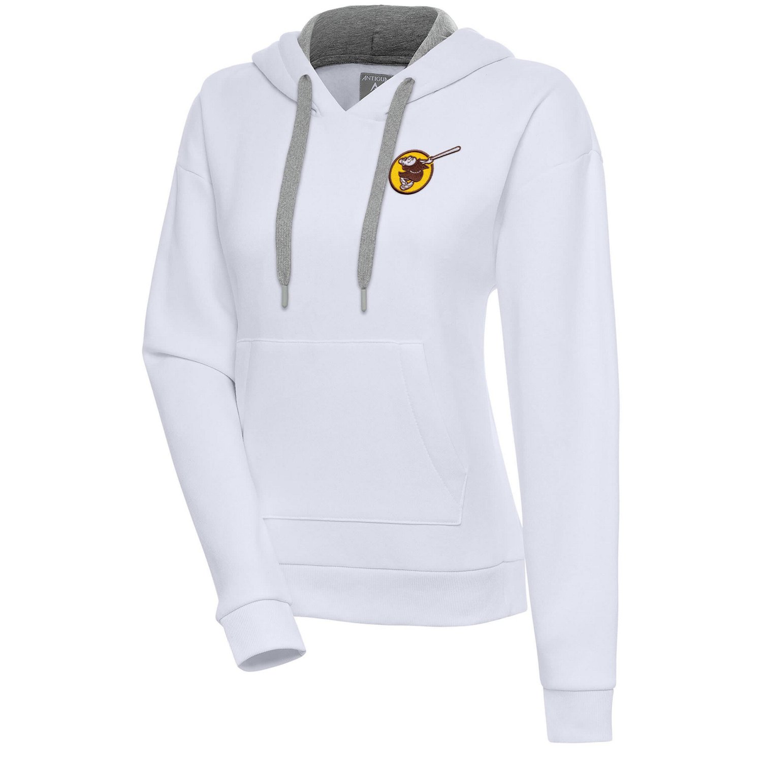The Women's Antigua White San Diego Padres Cooperstown Victory Pullover Hoodie is the perfect way to show your support for the San Diego Padres Made from a comfortable cotton and polyester blend this lightweight hoodie is perfect for mild temperatures Front pouch pockets store essentials while the drawstring hood keeps you warm on chilly nights Rib-knit cuffs and waist ensure a snug fit and the San Diego Padres logo is proudly displayed on the front Whether cheering at the stadium or relaxing at home this hoodie keeps you comfortable and stylish