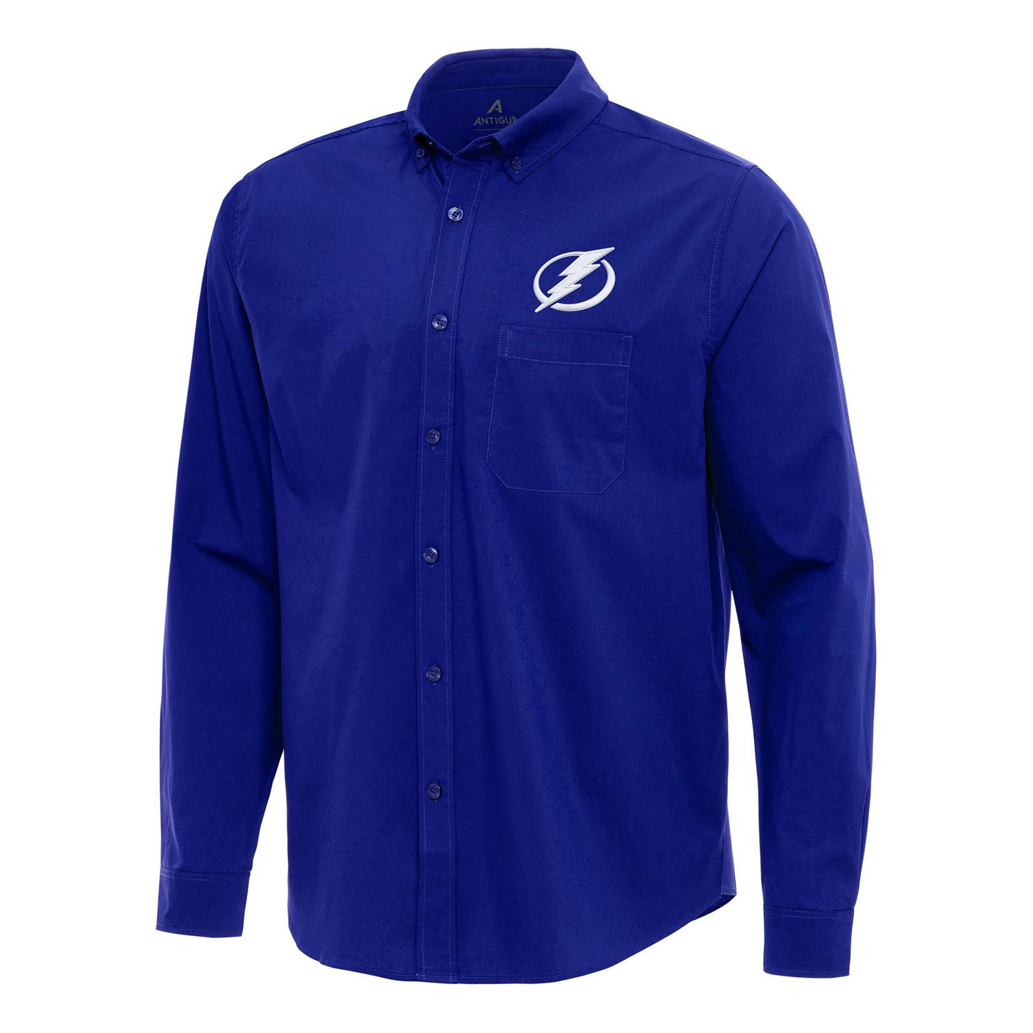 Elevate your Tampa Bay Lightning game day look with this Antigua Flight Woven Tri-Blend Long Sleeve Button-Down Shirt This Tampa Bay Lightning shirt is made with a tri-blend material for a comfortable fit that moves with you The embroidered team logo patch heat sealed above the left chest pocket adds a touch of sophistication to this already stylish piece