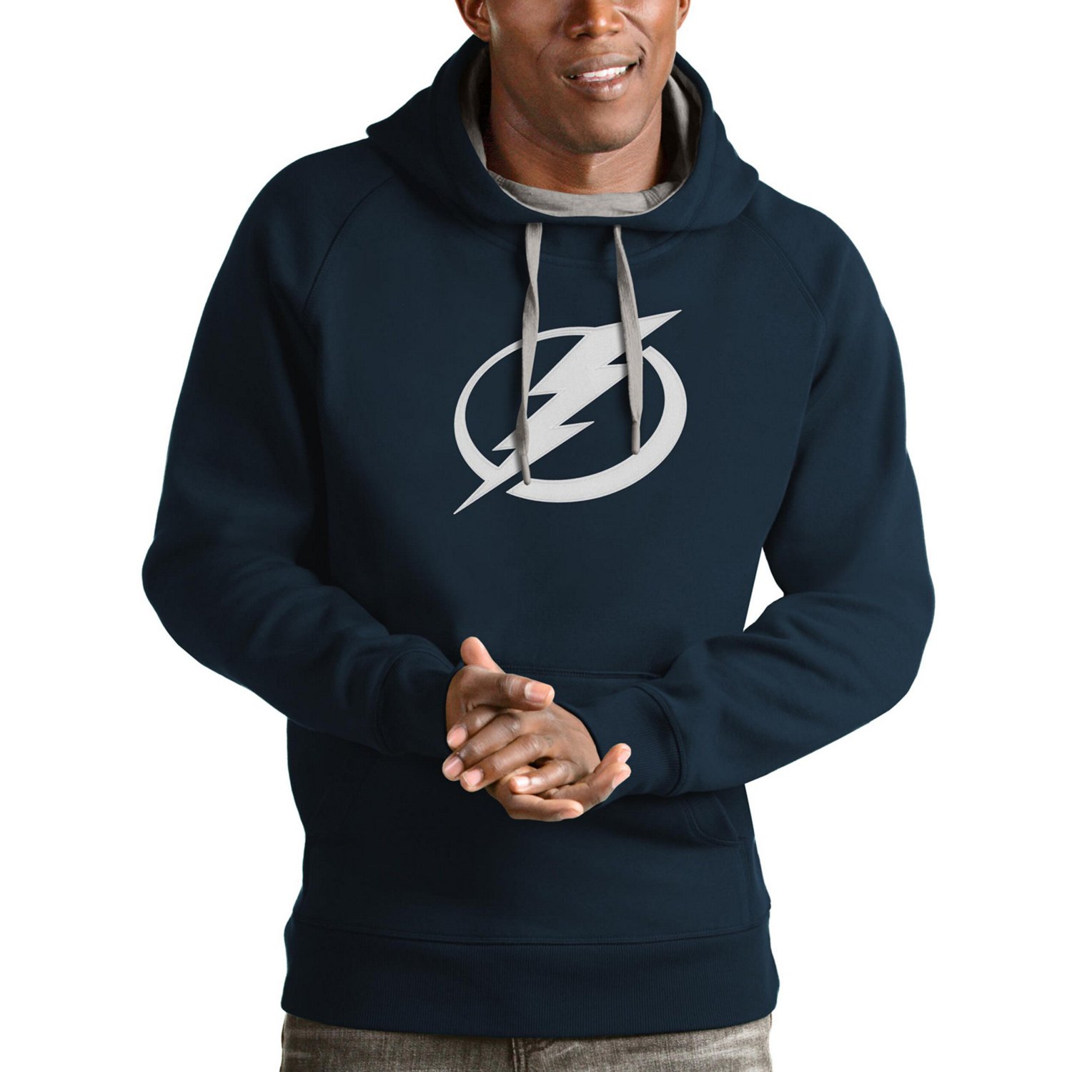 Represent your Tampa Bay Lightning pride with the Antigua Blue Tampa Bay Lightning Logo Victory Pullover Hoodie This midweight hoodie is perfect for moderate temperatures featuring embroidered graphics that proudly display your allegiance to the Lightning The front pouch pocket provides convenient storage while the adjustable drawstrings ensure a comfortable fit Whether you're cheering from the stands or simply showing your support this hoodie is a must-have for any Tampa Bay Lightning fan