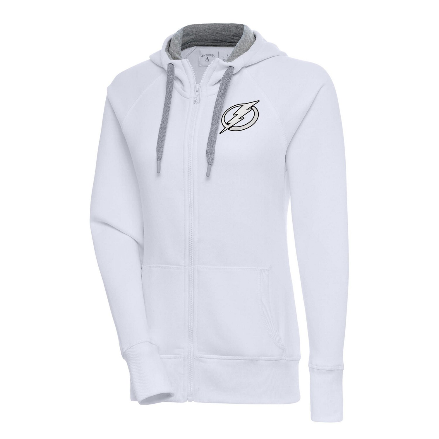 The Antigua Women's Tampa Bay Lightning Metallic Logo Victory Full-Zip Hoodie is the perfect way to show your support for the Tampa Bay Lightning Made of a comfortable polyester and spandex blend this midweight hoodie features a jersey-lined hood with drawcord ribbed details at the cuffs hem and pockets and heat-sealed graphics that showcase your Tampa Bay Lightning pride Whether you're cheering at the game or relaxing at home this hoodie will keep you warm and stylish