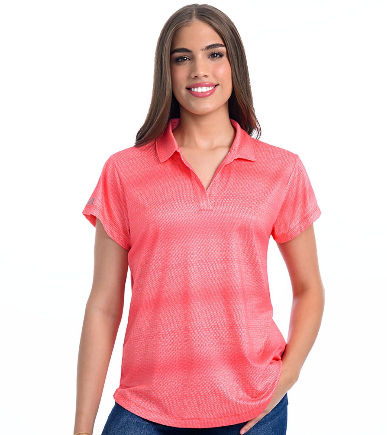 Look your best in the Antigua Women's Horizon Polo Shirt. It is made of 95% polyester and 5% polyester. The V-neck collar adds a layer of sophistication, and its side vents enhance breathability. The self-fabric collar with sleeve edge stitching finishes off the design.