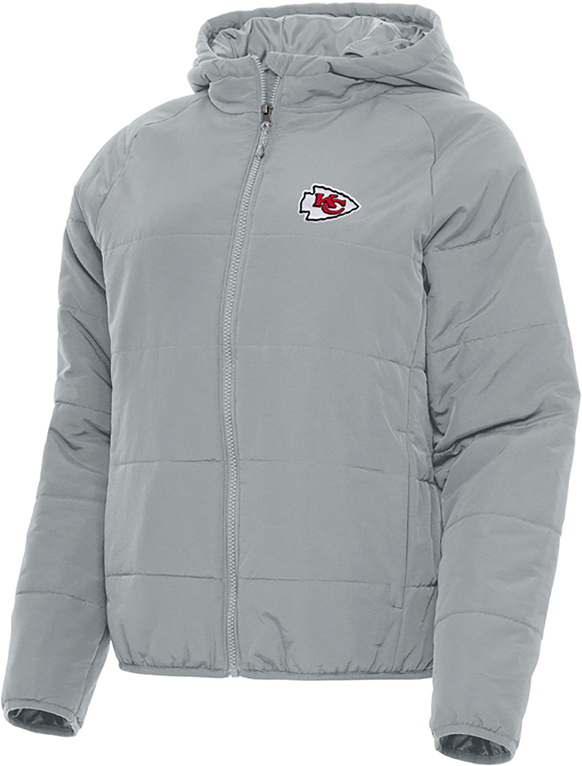 Stay warm while tailgating in the Antigua Women's Kansas City Chiefs Universe Jacket. This puffer-style jacket is made of lightweight polyester with polyester insulation and in inner liner. It is designed to keep you warm and protected without adding extra weight, and the Chiefs logo make it a great addition to any gameday wardrobe.