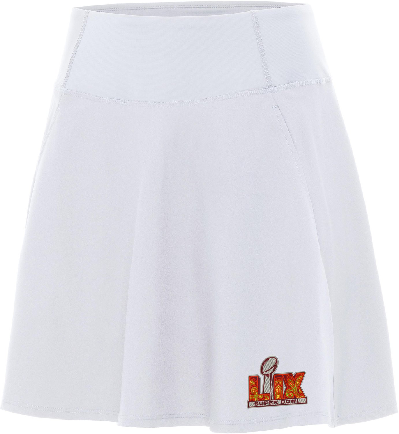 Celebrate Super Bowl LIX with the Antigua Women's NFL Super Bowl LIX Chip Skort. Designed with a built-in short and elastic waistband, this sporty skort offers both comfort and style for an active lifestyle. The fit and flare design combined with the poly sheen fabric ensures you stay chic and comfortable whether you're on the move or cheering from the sidelines.