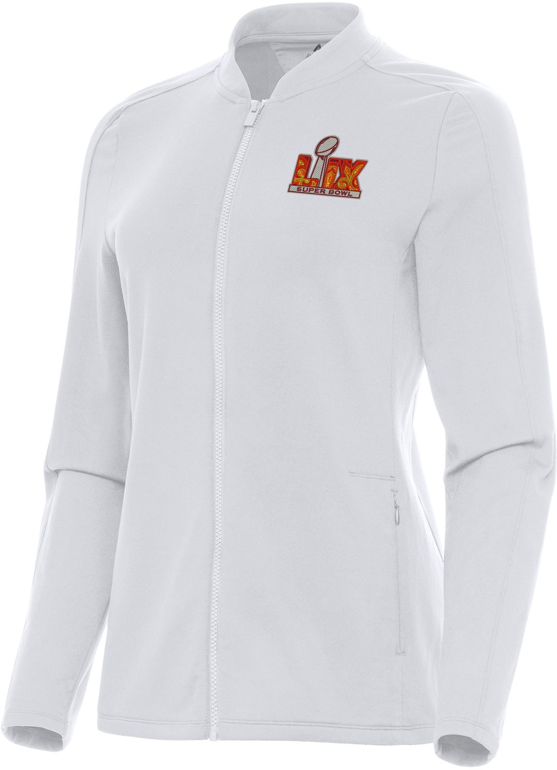 Stay ready for game day with the Antigua Women's NFL Super Bowl LIX Continual Jacket. Featuring embroidered Super Bowl LIX graphics, this lightweight jacket is perfect for layering and everyday wear. With side pockets and a full-zip front, it combines practicality with style, keeping you comfortable while showing off your NFL pride.