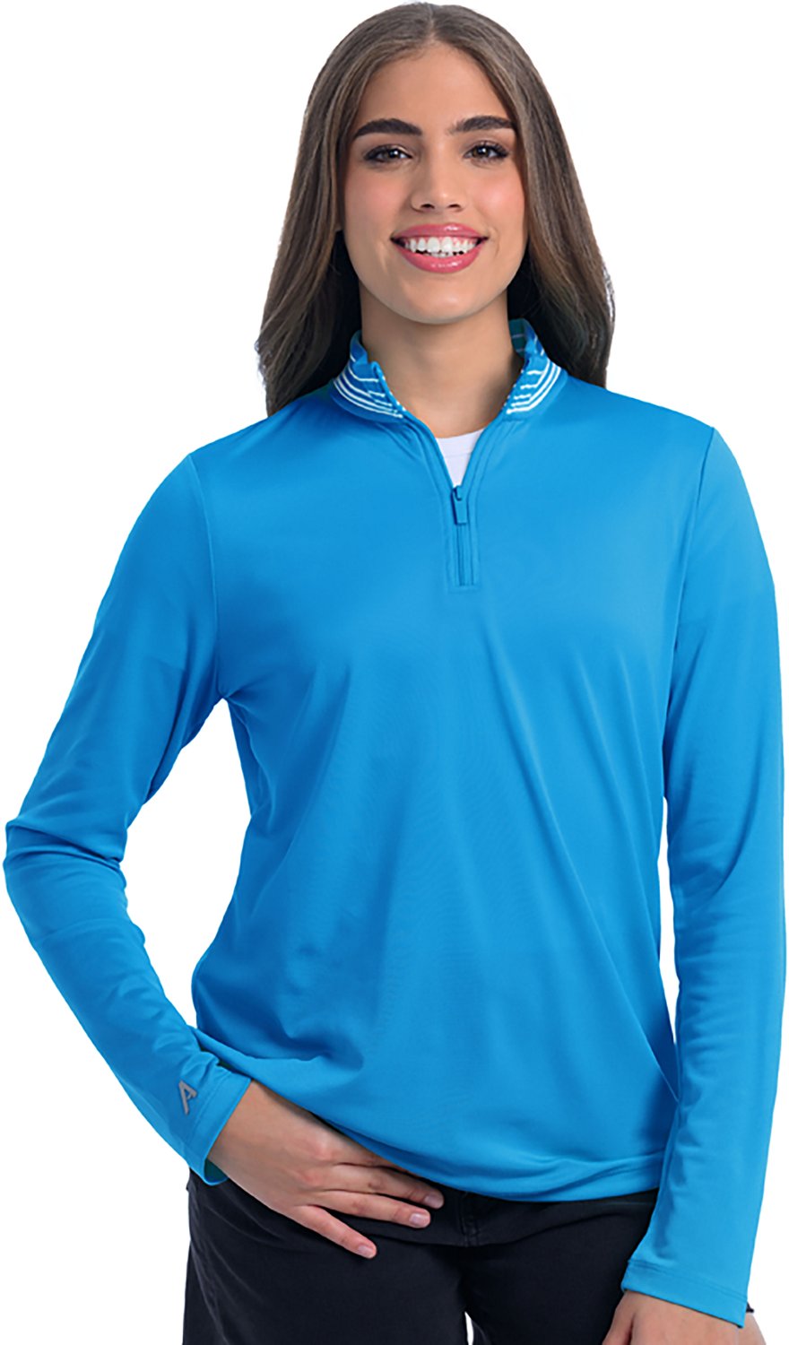 Look your best in the Antigua Women's Palmetto 1/4 Zip Pullover. It is made of 94% polyester and 6% spandex. The drop needle collar has a striped pattern, and its 1/4 zip provides security. The pullover design offers an easy on and off.