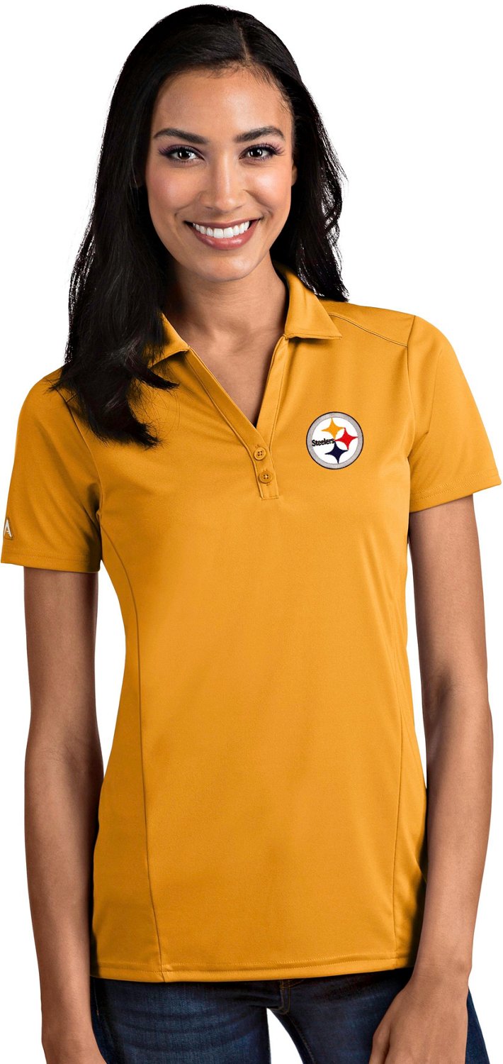 Show your support for the Steelers in the Antigua Women's Pittsburgh Steelers Tribute Polo Shirt. The 100% polyester construction offers comfy, long-lasting wear, and the 2-button placket provides a classic look. The Desert Dry™ technology helps keep sweat at bay. Shop at Academy.com for more NFL apparel.
