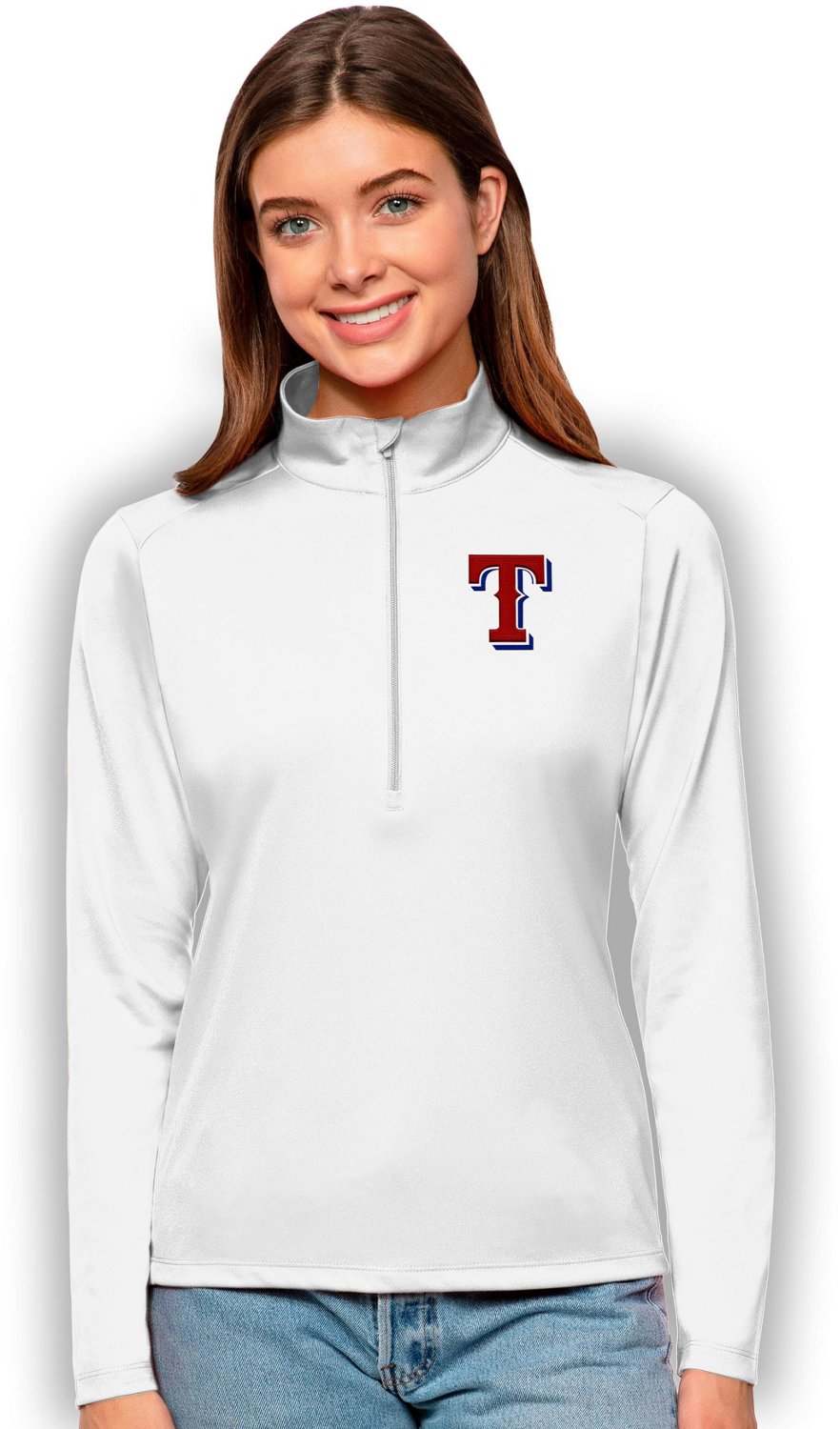 Represent your team on the water or the golf course when you wear an Antigua Women's Texas Rangers Tribute Pullover. This lightweight interlock pullover provides UPF 50+ protection in harsh sunlight. The 1/4 zip closure lets you adjust your coverage while a logo graphic puts team spirit on display.
