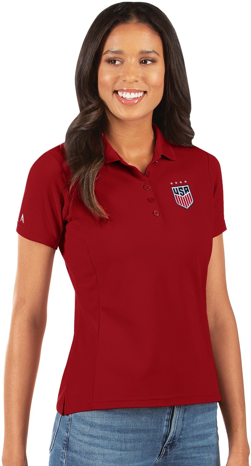 Stay comfortable in the Antigua Women's USA Legacy Pique Polo Shirt. This polo shirt is made of polyester pique knit for durability and has an Antigua triangle patch at the right cuff.