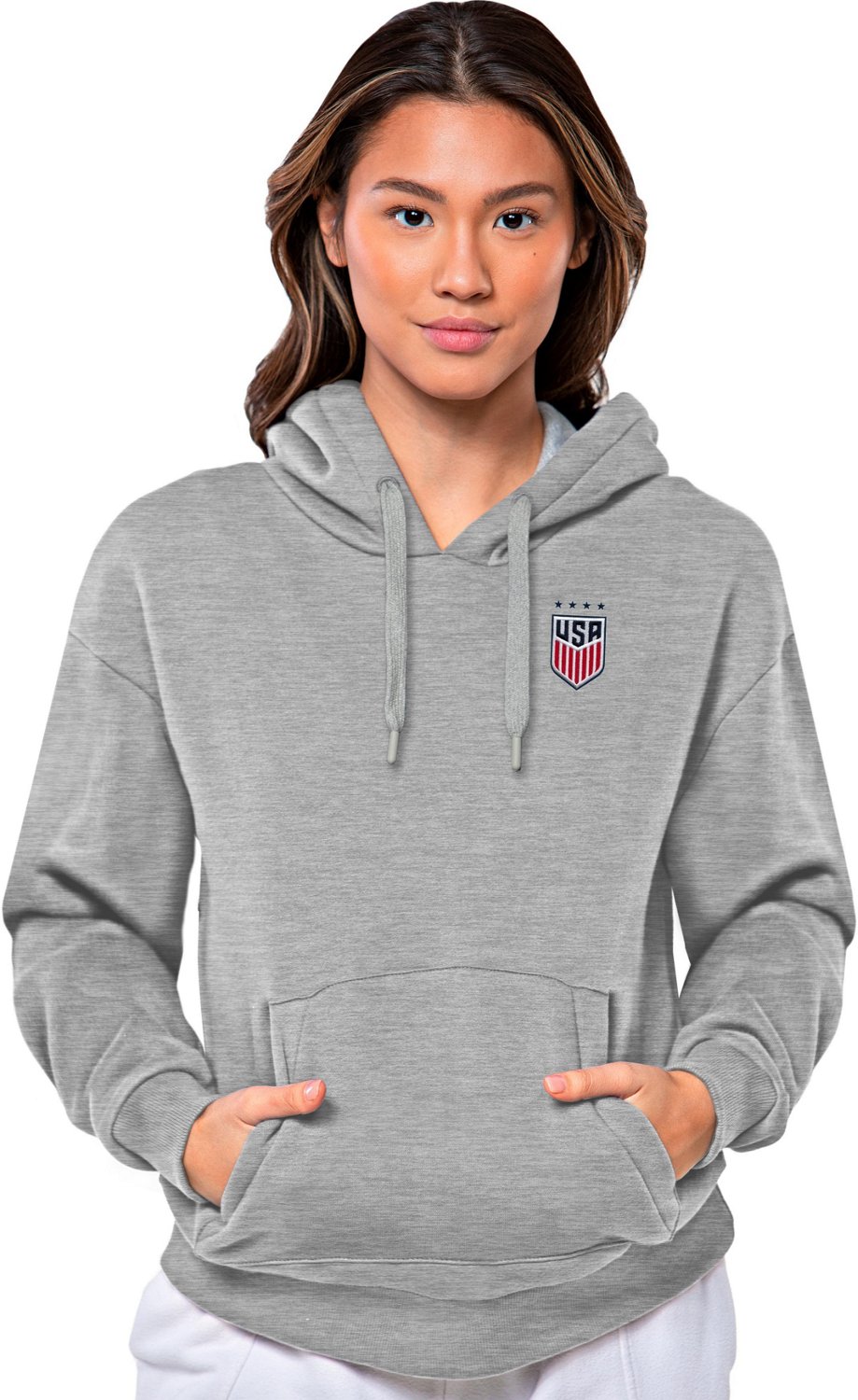 Keep cozy in the Antigua Women's USA Victory Pullover Hoodie. This pullover hoodie is made of 52% cotton and 48% polyester jersey for comfort and softness. The hood and ribbed hem provide added warmth.