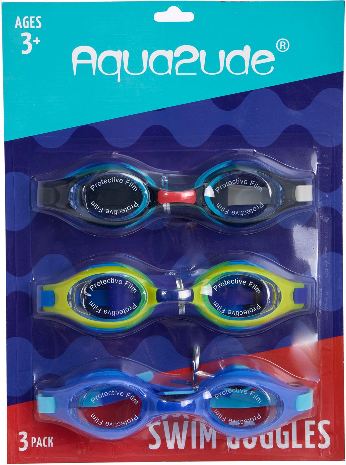 Jump into the pool and swim for hours wearing the Aqua2ude Boys' Color Swim Goggles 3-Pack. The googles help keep out water from getting into your eyes and irritating them, and they let you see clearly as you dive and swim beneath the water. The three different colored goggles deliver fun looks.