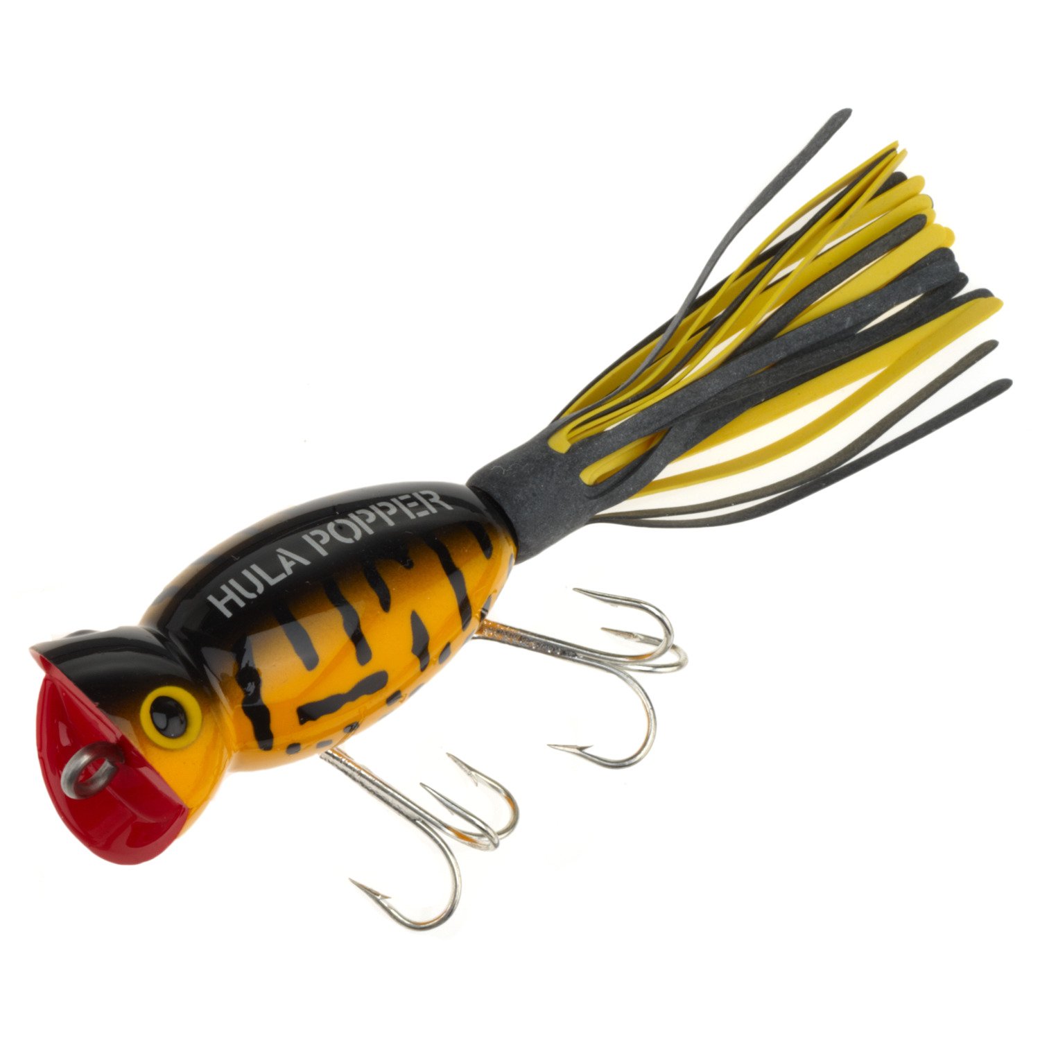 Catch largemouth bass, smallmouth bass and northern pike with the Arbogast Hula Popper 2" Lure. The lure features a pulsating skirt to attract the attention of fish when the lure is popped over submerged timber, weeds and grass beds. 3/8 oz. Size 4 treble hooks.