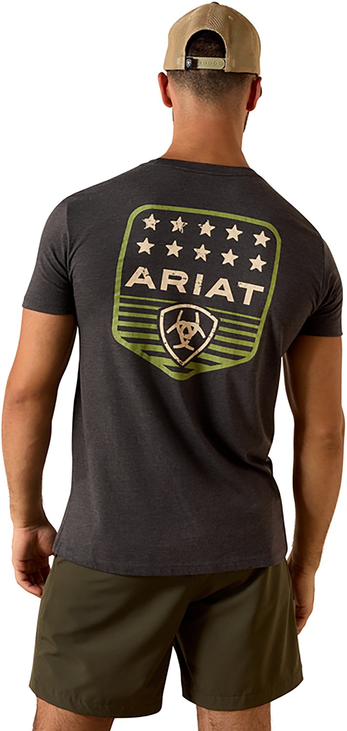 Look your best when you wear the Ariat Men's Ariat Stripe Patriotic Badge T-shirt. It is made of 100% cotton. The short sleeves keep you cool, and its crew neckline creates a casual look. The screen printed logo on the back and front left chest adds an official touch.