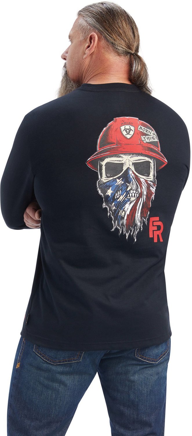 Stay safe in the workplace with the Ariat Men's Flame-Resistant Born For This Graphic Short Sleeve T-shirt. The cotton fabric provides comfort for the whole day, while the flame-resistant construction is dual-rated for protection from workplace hazards. The graphic design creates a stylish appearance.