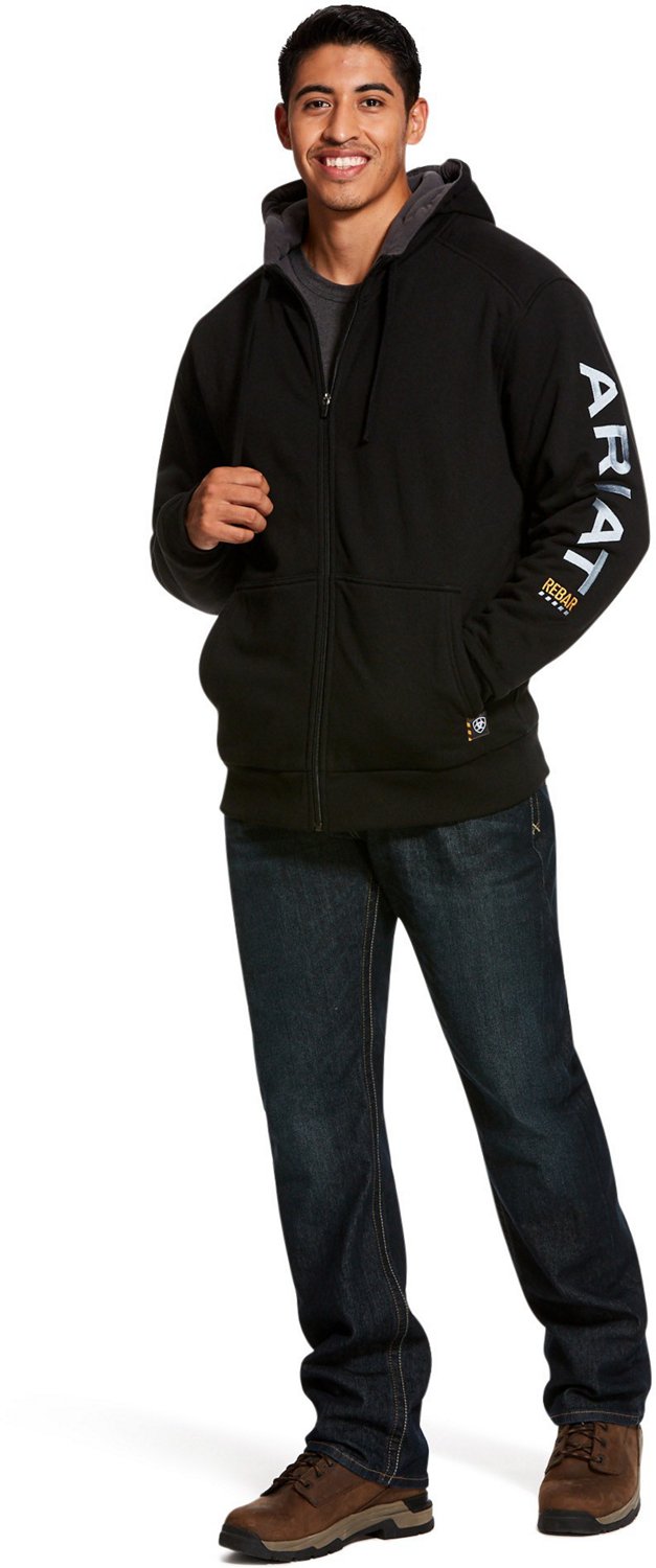 Stay warm and toasty when you work in the cold by wearing the Ariat Men's Rebar All-Weather Full-Zip Hoodie. This hoodie provides all-weather fabrication for comfort and has front kangaroo pockets for small storage. The hood helps protect against inclement conditions, and the hoodie sports brand graphics on the left sleeve.