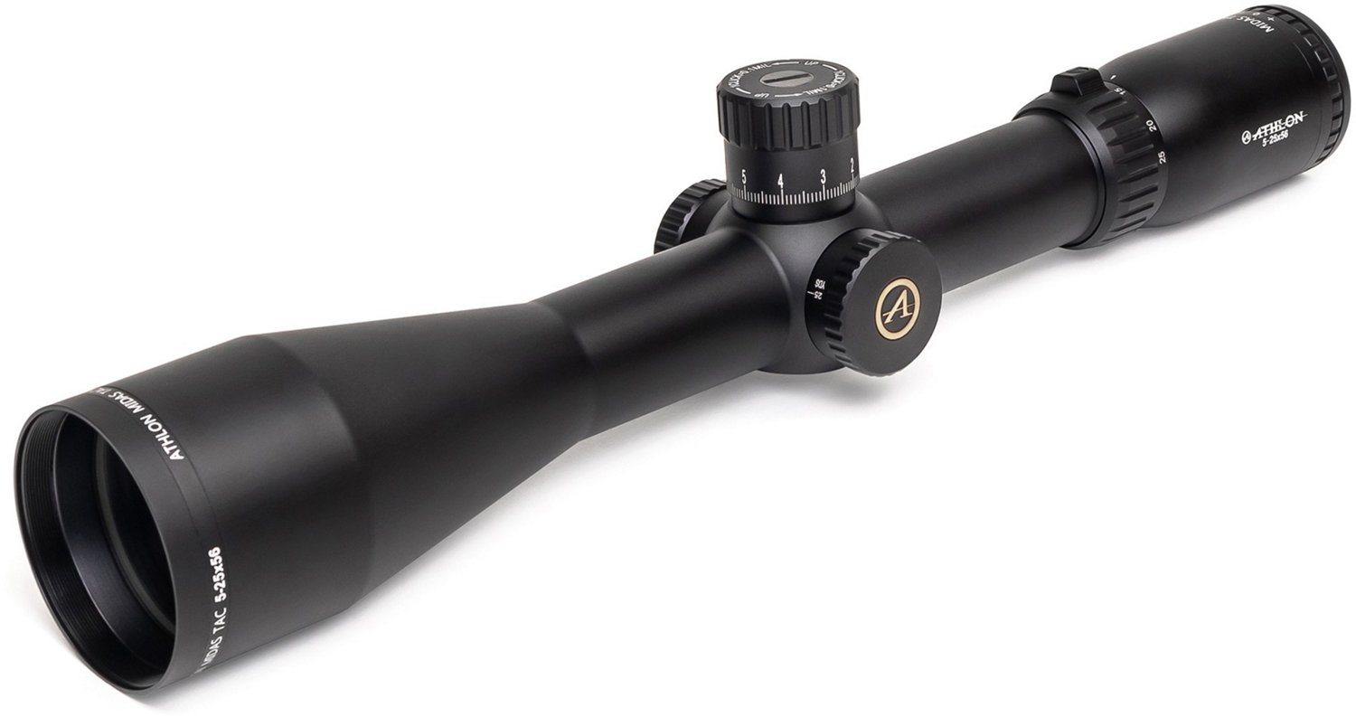 Perfect for close-range rimfire or long-range engagement, trust the Athlon Optics Midas TAC 5-25x56 Riflescope. This riflescope features advanced fully multicoated lenses to provide clear and bright images and an XPL coating to protect lenses from dirt, oil and scratches. The one-piece tube is hammer-forged from an aircraft aluminum alloy for strength, while the waterproof and fog-proof construction allows for use in a variety of weather conditions.