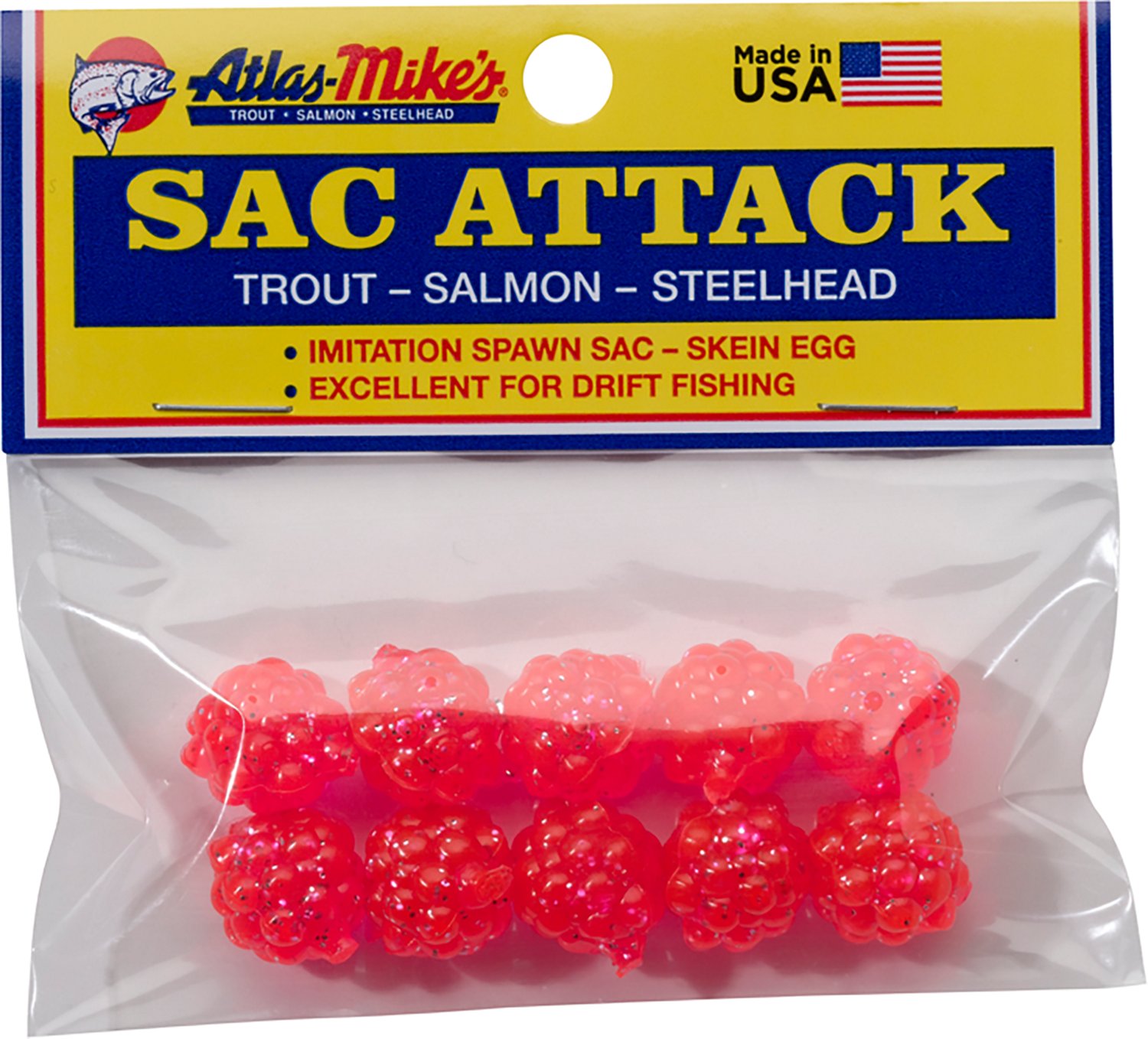 Lure in your next catch with the Atlas-Mike's Sac Attack Eggs 10-Pack. Suitable for fast water conditions, these eggs are ideal for steelhead, salmon and trout fishing.