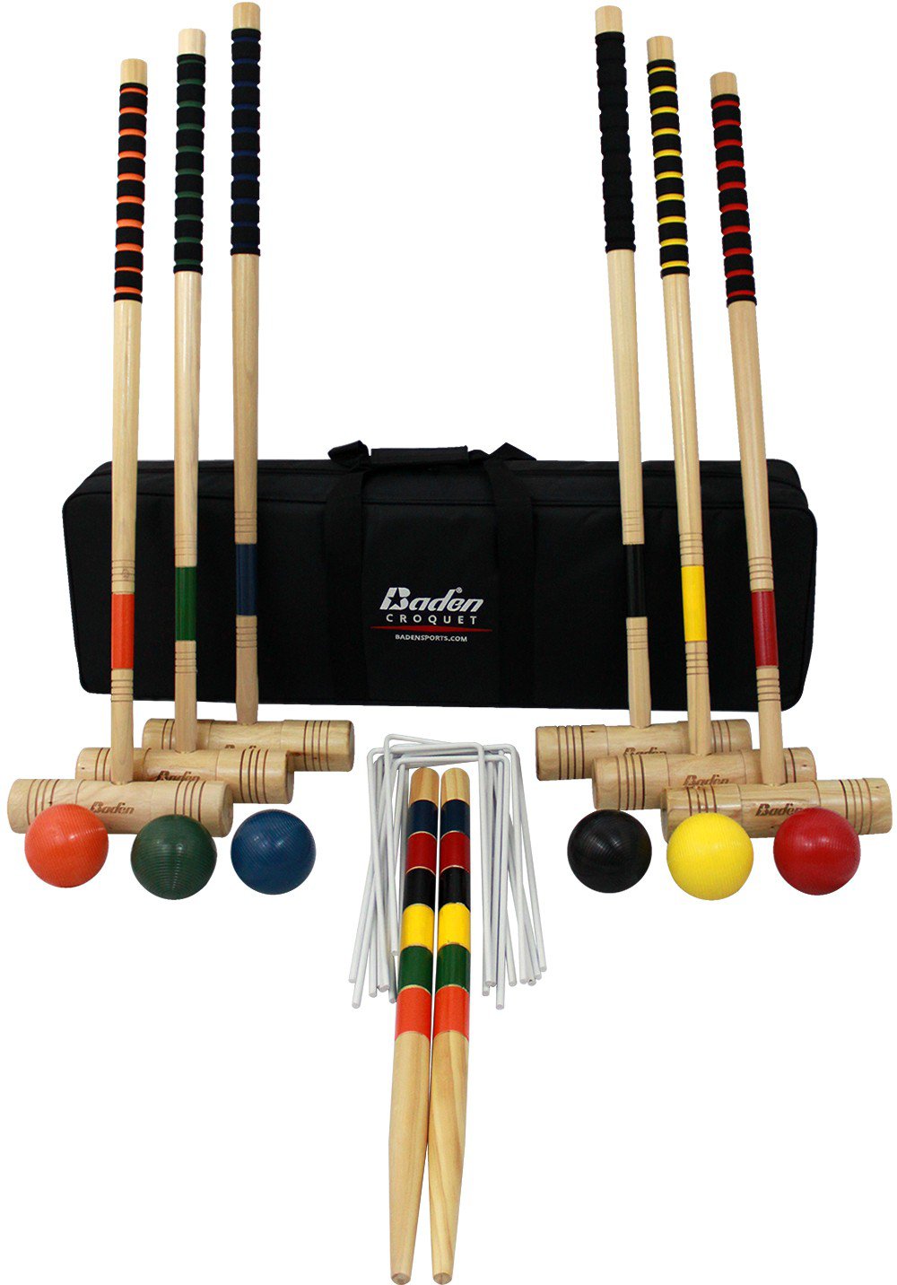 Set up a game of croquet among friends and family with the Baden Champion Series Croquet Set. The set contains 6 hardwood mallets with soft, rubber grip handles, 6 colored balls made of resin, 9 vinyl-coated, heavy gauge wickets and 2 solid hardwood end posts. The set also includes a waterproof carry bag and game rules.