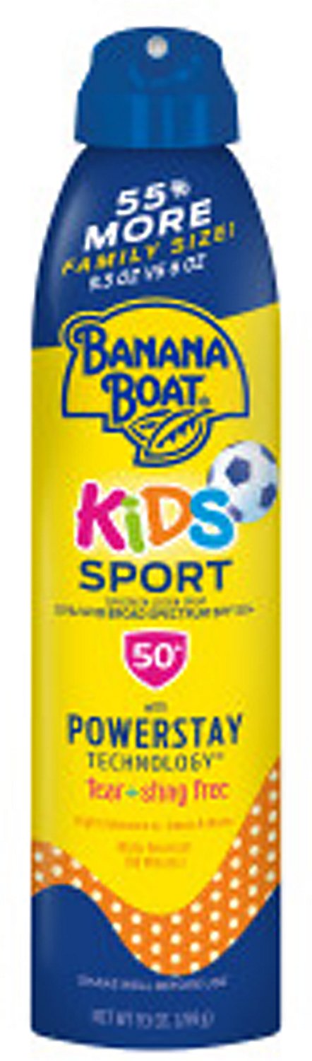 Protect your skin from the sun's harmful rays with the Banana Boat Kids' UltraMist Family Size 9.5 oz SPF 50 Sunscreen Spray. The PowerStay Technology® has a mild formula that won't irritate skin and provides strong sun protection during activities. It has clinically proven UVA/UVB protection, and its lightweight, quick-absorbing formula is reef friendly and water-resistant up to 80 minutes.