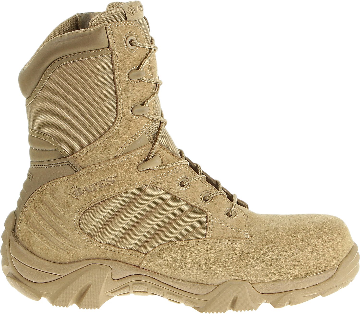 The Bates Men's GX-8 Desert Composite Toe Side-Zip Tactical Boots feature water- and stain-resistant Warrior Leather uppers and slip-resistant rubber outsoles for durability and traction. Breathable mesh linings and removable cushioned inserts provide comfort. Athletic cement construction for flexibility and light weight. Nonmetallic composite safety toes. Side zippers for easy on and off.