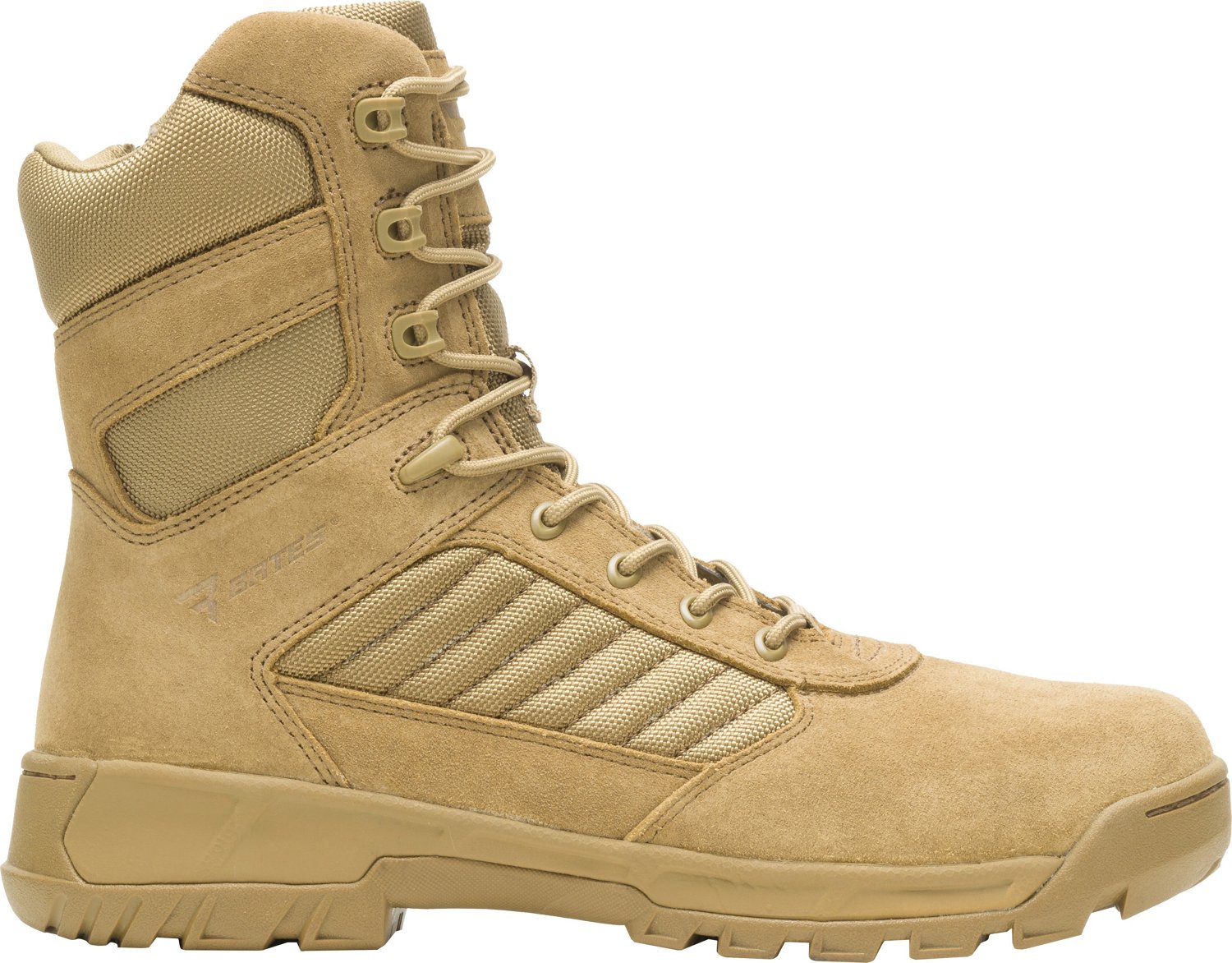 Step onto the field with confidence in the Bates Men's Tactical Sport Khaki 2 Boots. The full grain leather and performance denier polyester uppers offer durability and lightweight wear, while the slip- and oil-resistant TacTRACTION™ rubber outsoles with Flex Channels offer a flexible fit and reliable traction on slick surfaces.