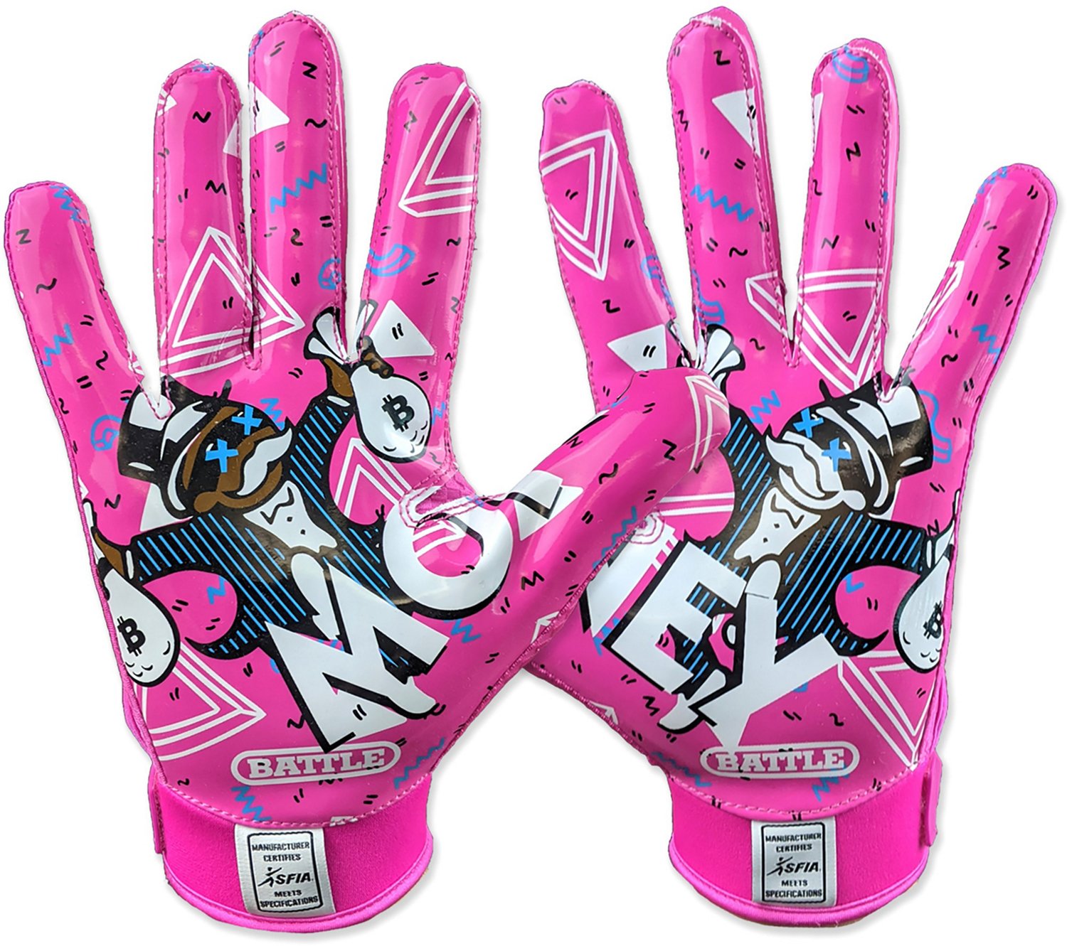 Play like the pros with the Battle Adults' Money Man 2.0 Football Gloves. These gloves are made with PerfectFit breathable materials for comfortable wear. The reinforced stitching and wear points provide added durability, while the Ultra-Stick palm takes you right to the legal stick limit to allow for great grip.