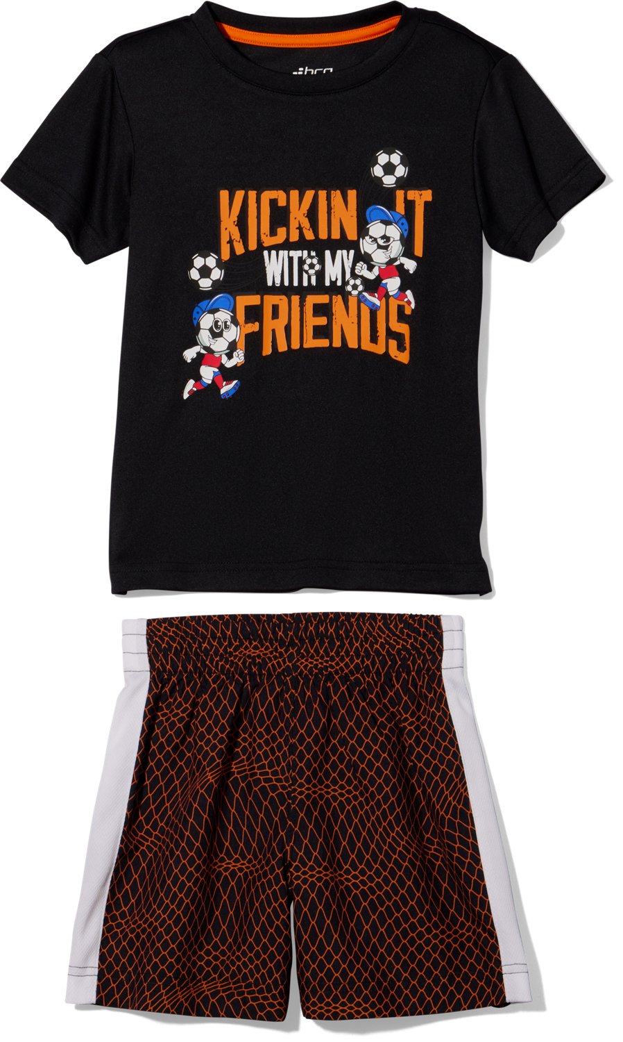 Have your little one looking their best when they wear the BCG Boys' 4-7 Kicking It Shorts Set. Its short sleeves keep them cool. The crew neckline creates a casual look, and its graphic on the front chest adds a unique touch. The elastic waistband provides a comfortable fit.