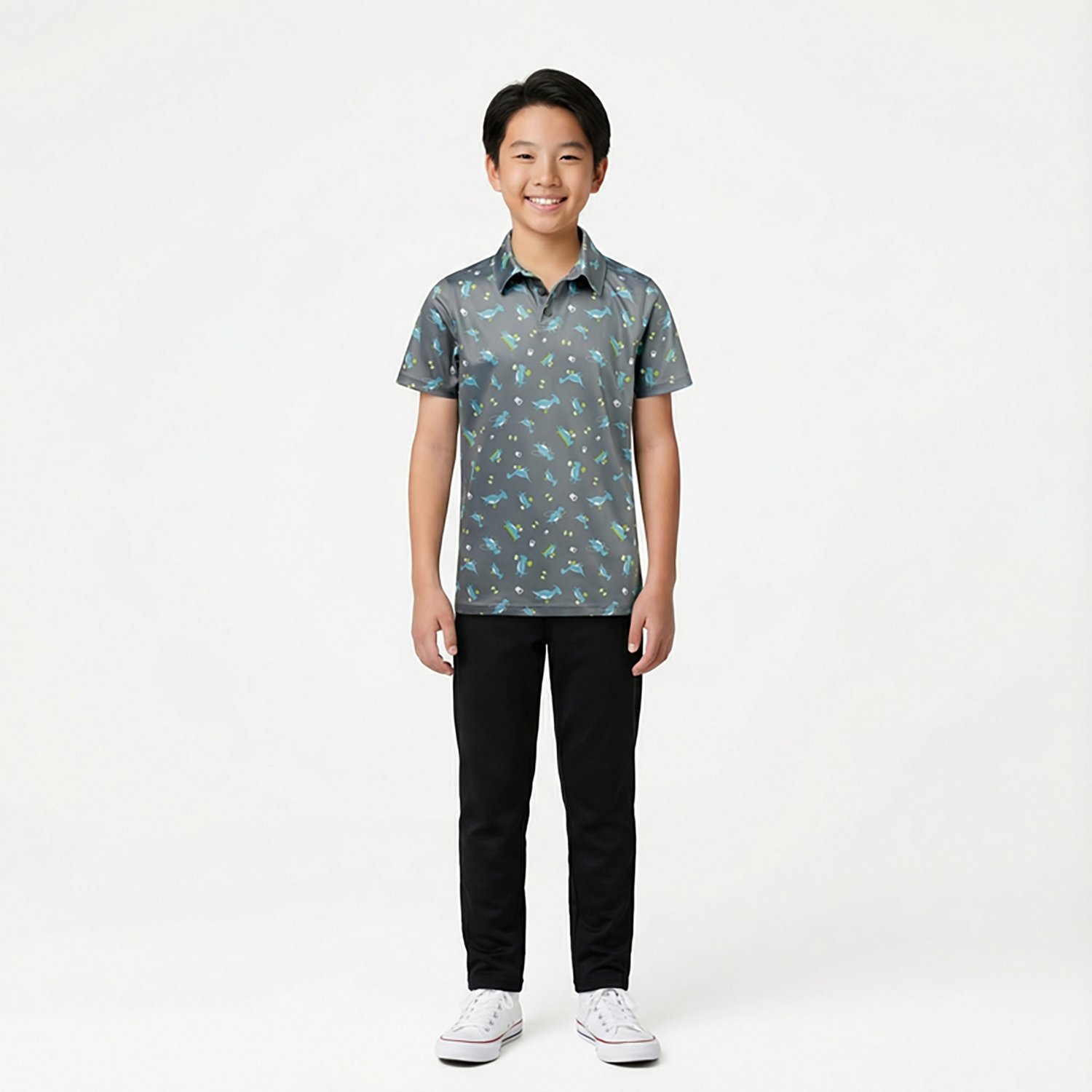 Features and Benefits Polyester material delivers durability Lightweight structure brings relaxed feel Moisture-wicking fabric keeps surfaces dry Three-button placket sets closure Short sleeves give comfort Collar presents classy look Loose fit permits maneuverability UPF 50 rating offers sunlight protection Allover printed body displays flair Specifications Compression: No Clothing Type: Casual Shirts Neckline: Collar Sleeve length: Short Sleeve Material technology: Moisture wicking Activity: Golf Material: Polyester Heat Retention: No Gender: Boys' Size Range: Boys' (8 - 20) Moisture Wicking: Yes Care: Machine wash Product Type: Shirts Flame Resistant: No Age Group: Kids' Style: Polos Features: Moisture Wicking Hood: No Placket: Three-button What's in the Box BCG Boys' Golf Dino Gym Short Sleeve Polo