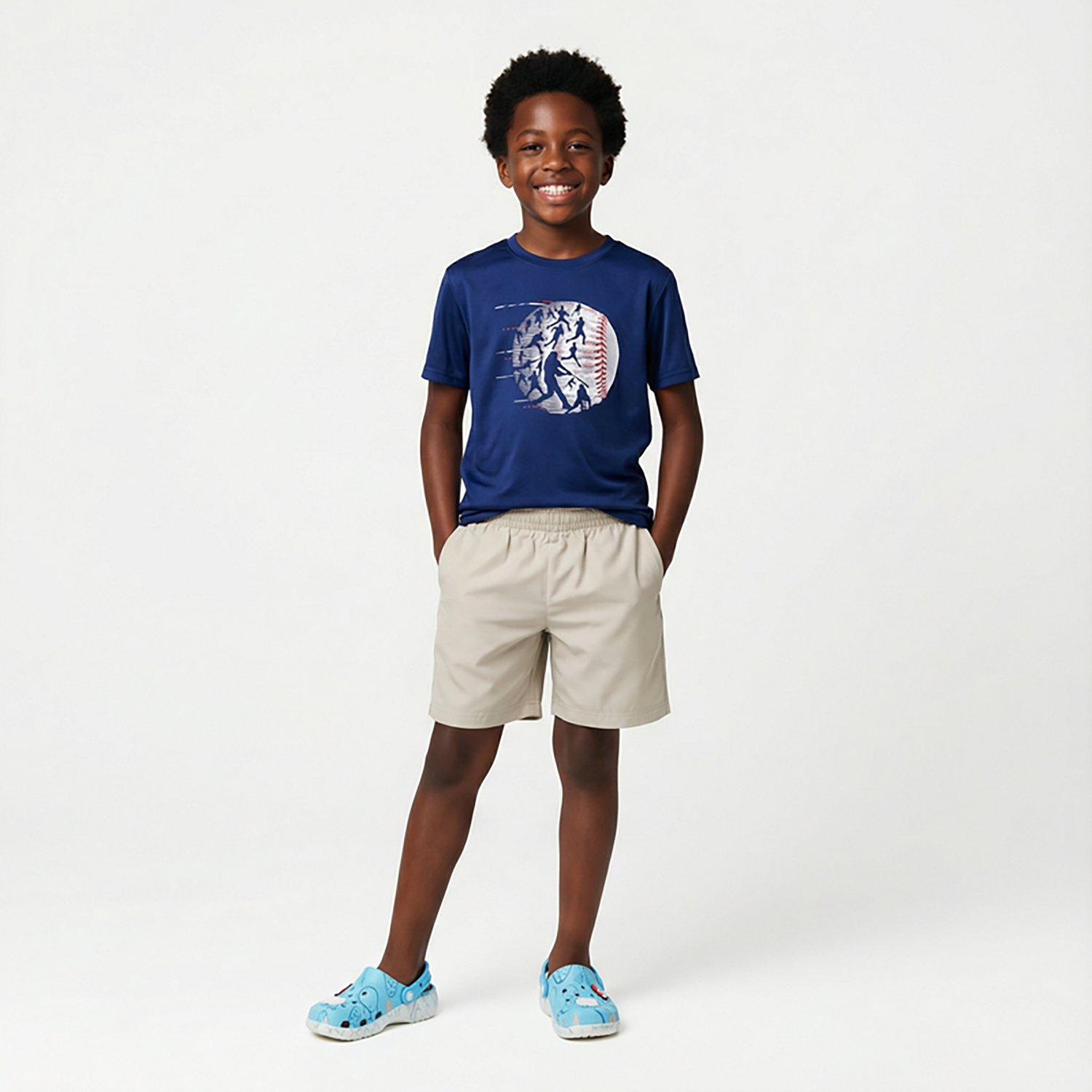 Keep kids comfortable on the playground or at sports practice with the BCG Boys' Playground Shorts. The durable polyester construction is water-repellent for extra protection. The elastic waistband tightens with a drawstring, while side vents help him move freely.
