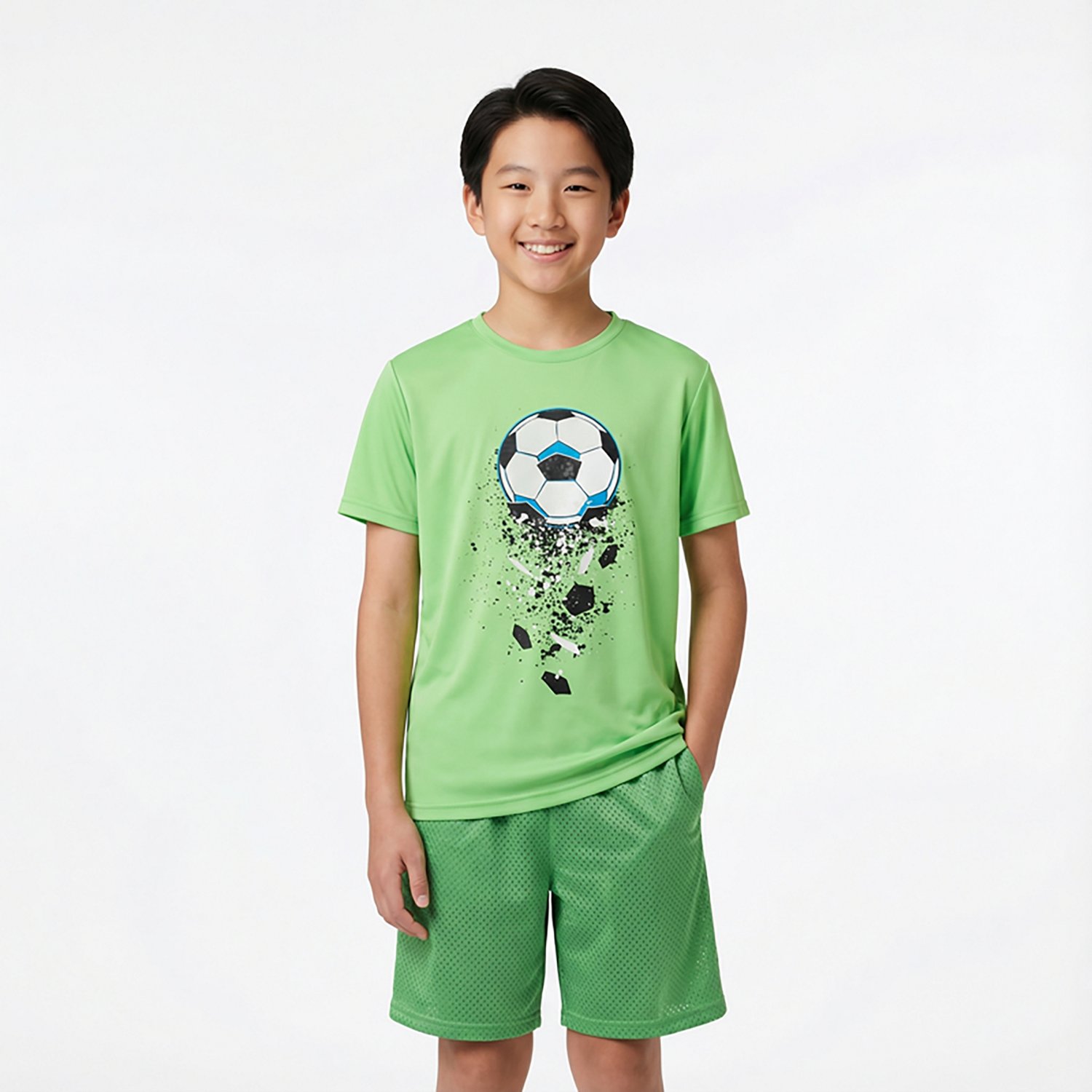 Have your little one looking their best in the BCG Boys' Turbo Soccer Speckle Short Sleeve T-shirt. It is made of 100% polyester for lasting wear, and the graphic of a soccer ball on the chest creates a sporty vibe.