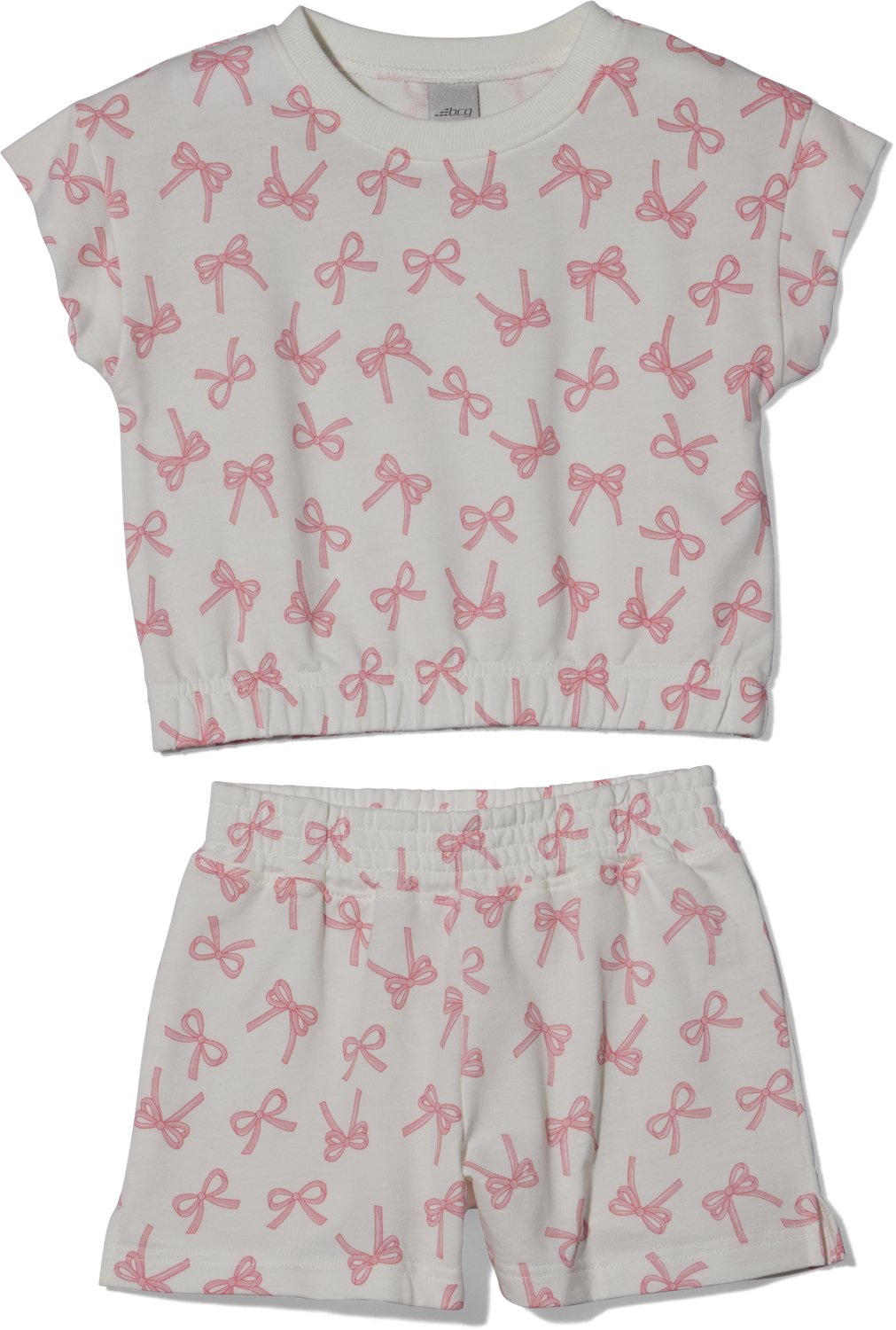 She will look adorable wherever she goes when wearing the BCG Girls' 4-6X Box Toss Terry Top and Shorts Set. This set includes a short-sleeve, crew-neck short and a coordinating pair of shorts, each made of French terry fabric for softness and featuring a cute bow pattern.