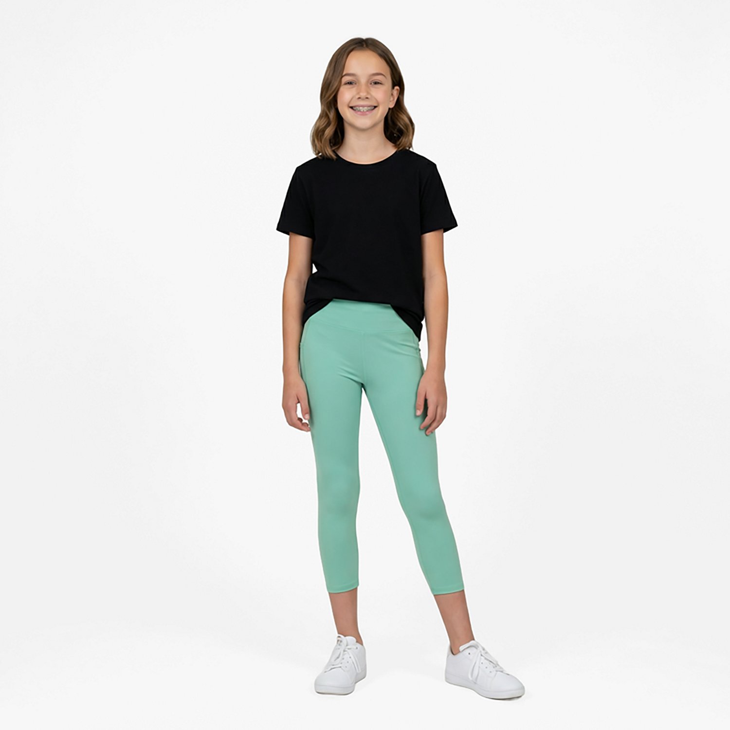 Look your best in the BCG Girls' Core 7/8 Leggings. They are made of 84% recycled polyester and 16% spandex. The moisture wicking technology keeps you dry, and their high-rise fit provides plenty of coverage. The 7/8 length makes your legs look longer.
