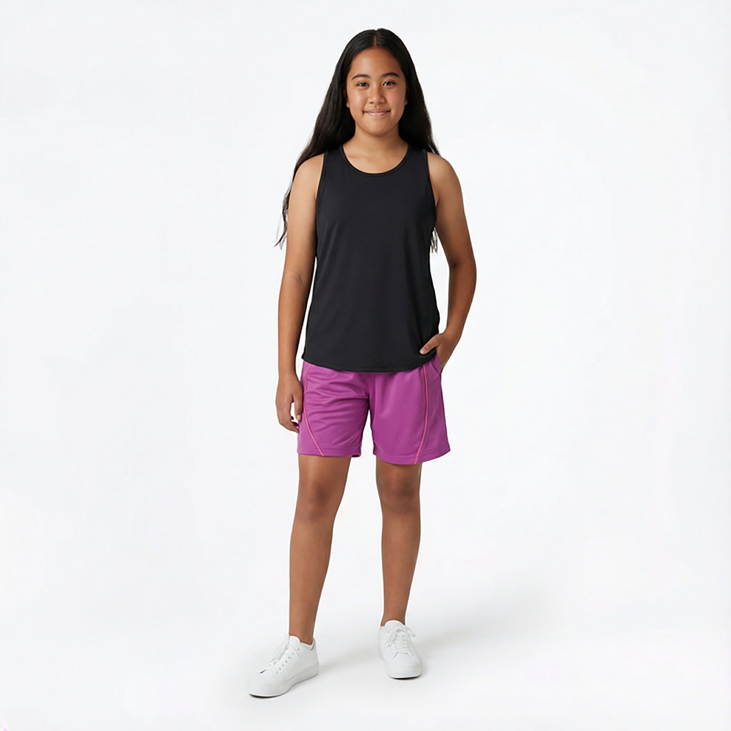 Features and Benefits 100% polyester material provides durability Closed hole mesh fabric offers lightweight breathability Moisture-wicking technology removes sweat for a fast dry 2 front side seam pockets allow you to store belongings Waistband with drawstring ensures an adjustable fit Color block piping add a stylish touch Specifications Compression: No Clothing Type: Athletic Shorts Ventilated: Yes Shorts Length: Short Material technology: Moisture Wicking Activity: Training,Basketball Material: Polyester Gender: Girls' Size Range: Girls' (4 - 6x) Moisture Wicking: Yes Water Resistant: No Product Type: Shorts Flame Resistant: No Age Group: Kids' Style: Basketball Shorts,Athletic Shorts Lining: No Features: Moisture Wicking What's in the Box BCG Girls' Court BB Shorts