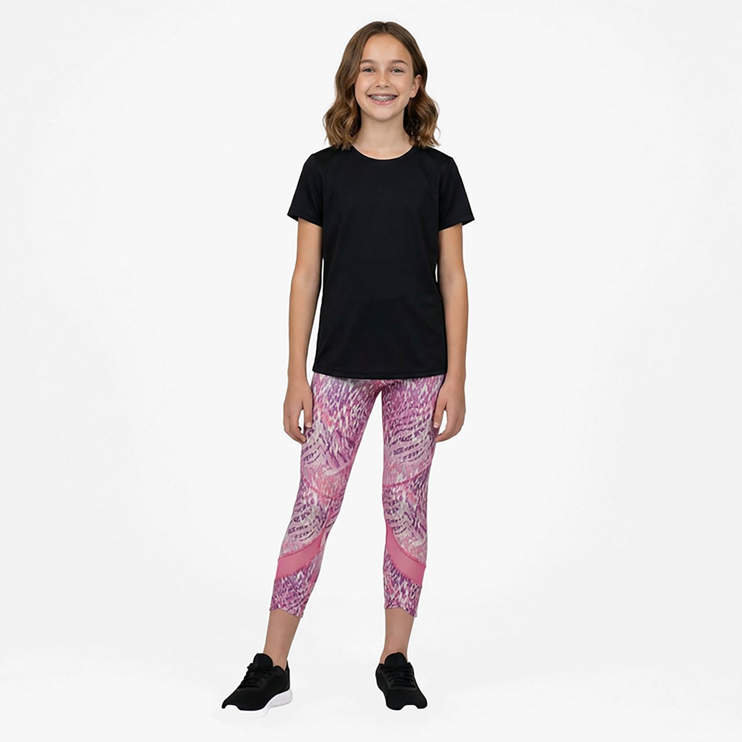 Look your best in the BCG Girls' High Rise Mesh Printed Leggings. They are made of 84% recycled polyester and 16% spandex. The moisture wicking technology keeps you dry, and their high-rise fit provides plenty of coverage. The printed design adds a touch of style.