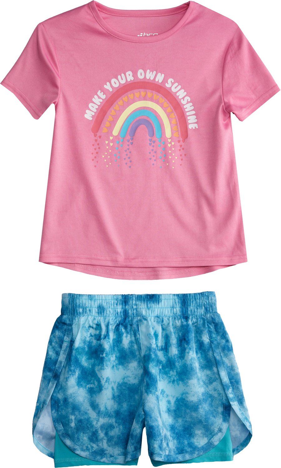 Enjoy the sunshine rocking the BCG Girls' 4-6x Make Sunshine Tie-Dye Shirt and Shorts Set. The polyester interlock construction feels soft all day long, and the polyester/spandex inner short lining helps make sure you feel covered. A tie-dye print and a rainbow graphic design highlight an eye-catching appearance.