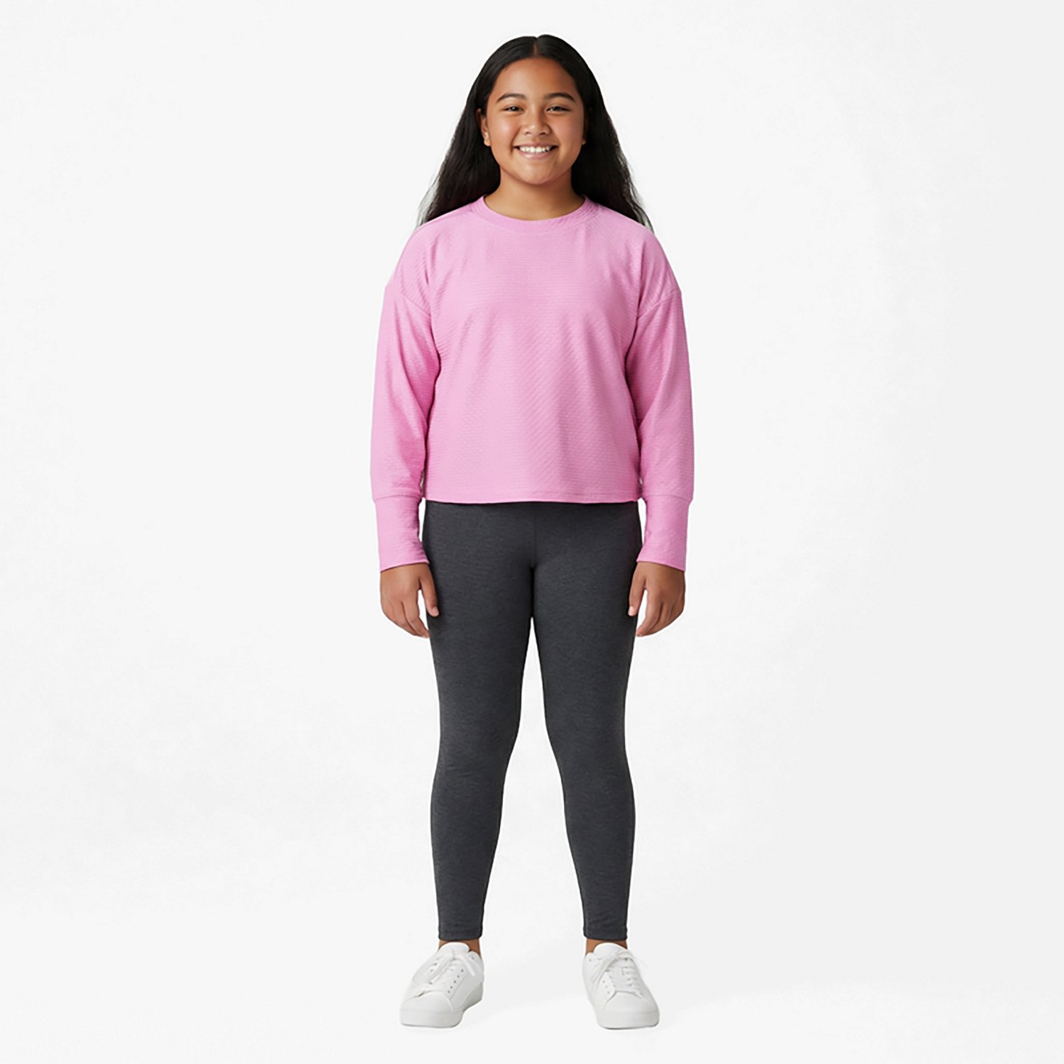 Train in comfortable apparel with the BCG Girls' Mesh Long Sleeve Top. The soft hand feel gives you an easygoing wearing experience, and the polyester and spandex material is built for frequent use. The long sleeves keep you warm, and the mesh pattern allows for airflow.