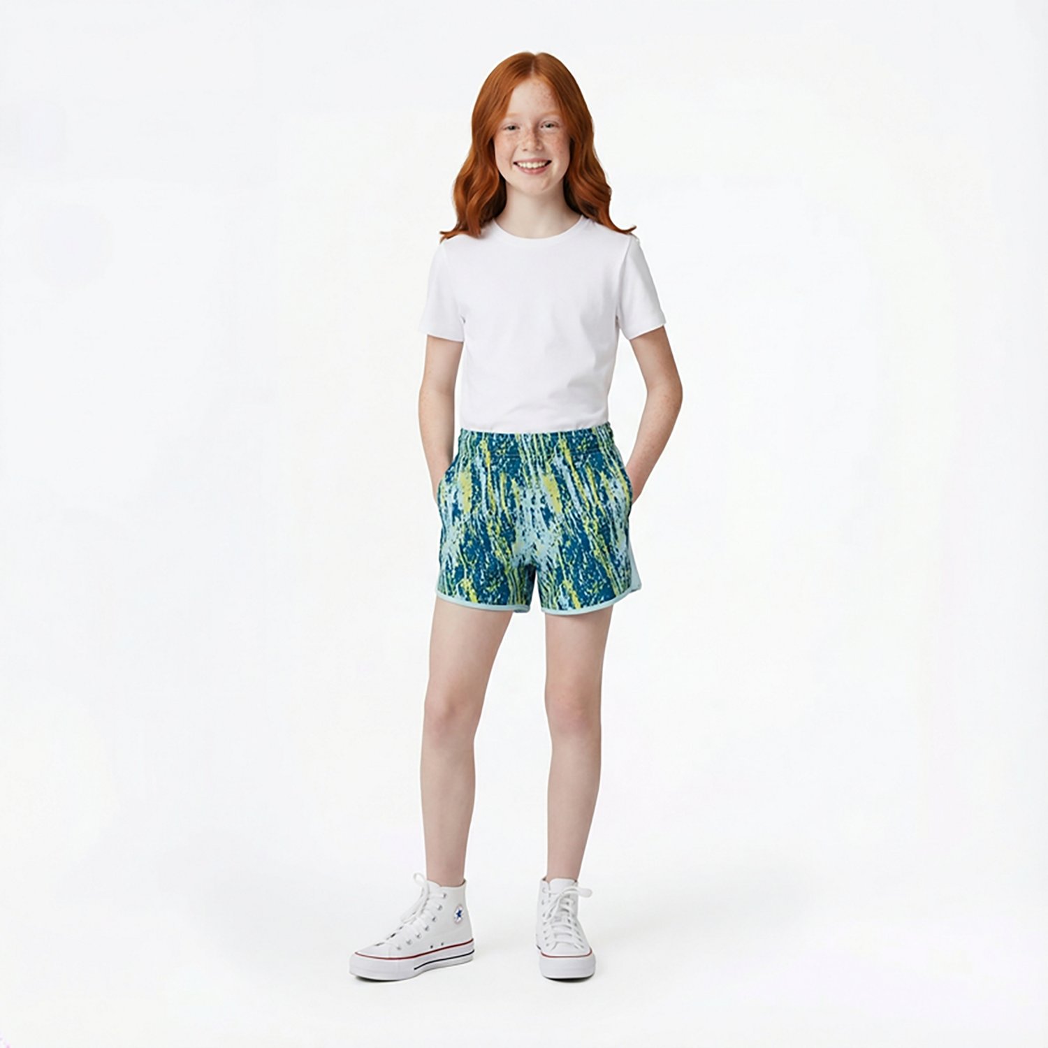 Stay cool while playing outside in the BCG Girls' Run Race Print Short. The polyester and elastane blends offers lightweight stretch, while antimicrobial technology protects you from germs. Moisture-wicking material and ventilated mesh on the side panels help you stay cool, while contrast color binding and mesh creates a colorful look. An elastic waistband stays in place so you can play hard, and the adjustable drawstring creates a custom fit.