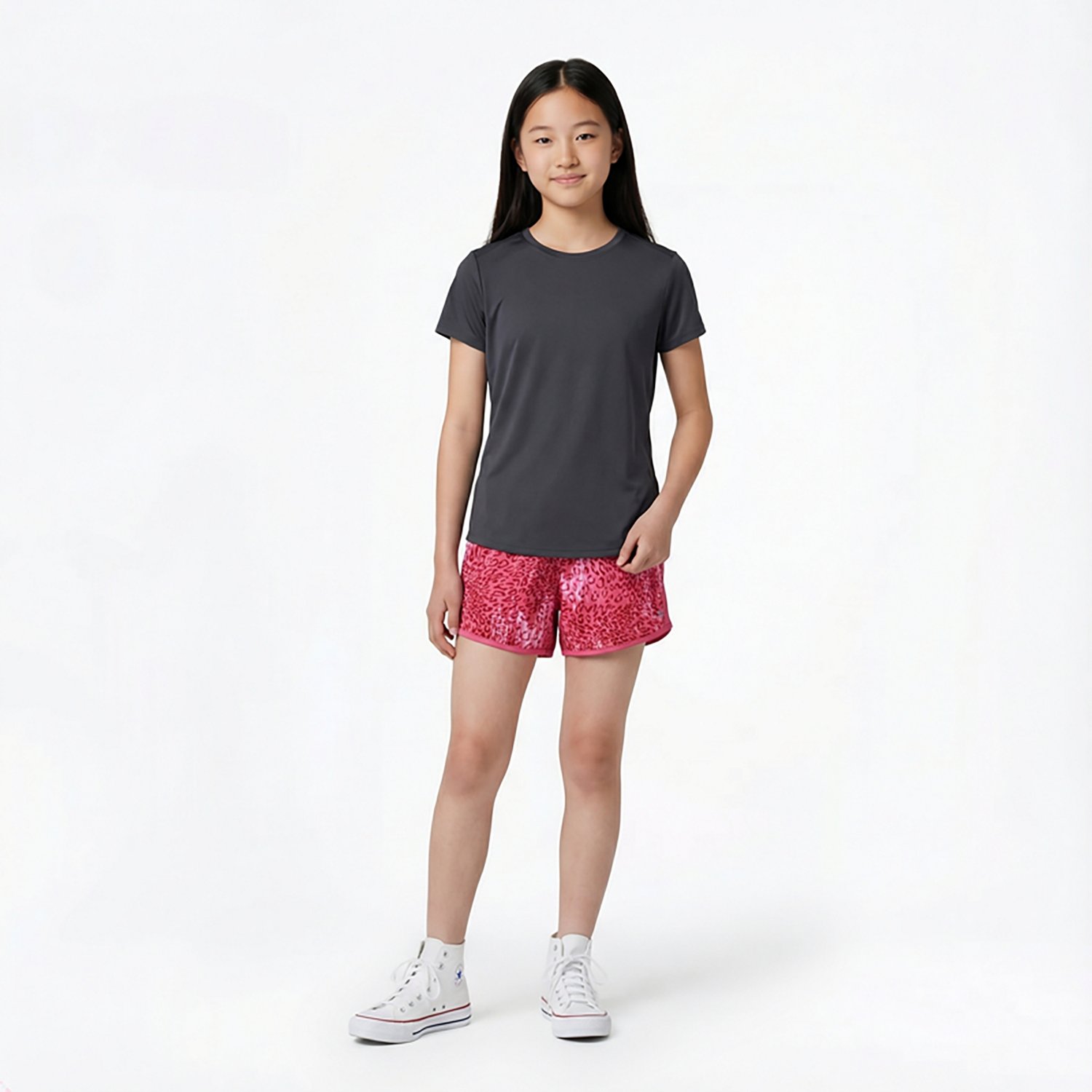 Stay cool while playing outside in the BCG Girls' Run Race Print Short. The polyester and elastane blends offers lightweight stretch, while antimicrobial technology protects you from germs. Moisture-wicking material and ventilated mesh on the side panels help you stay cool, while contrast color binding and mesh creates a colorful look. An elastic waistband stays in place so you can play hard, and the adjustable drawstring creates a custom fit.