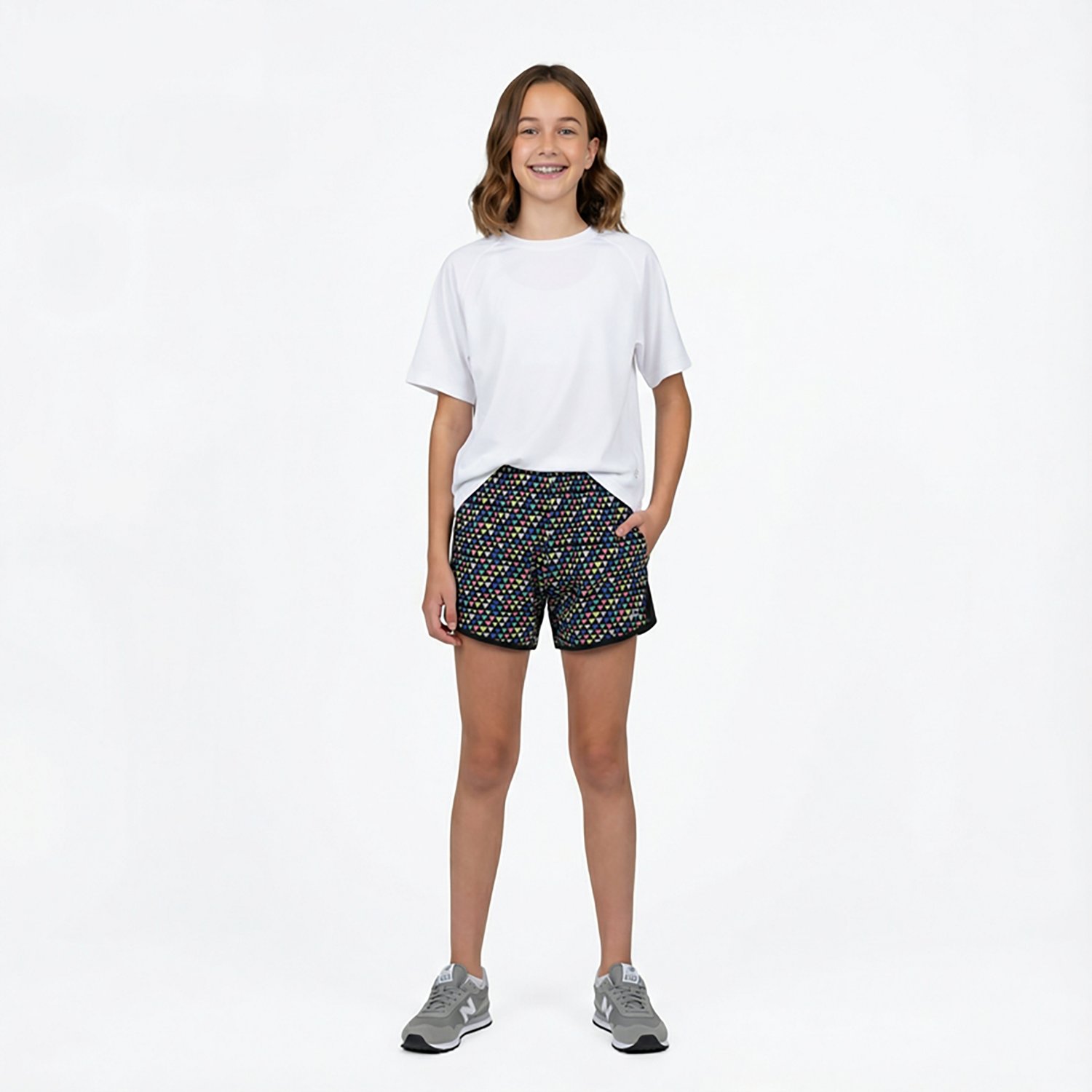 Go for a run with the BCG Girls' Run Race Print Shorts 3.5 in. The polyester and elastane material provides a comfortable feel, while the moisture wicking technology helps keep you cool and dry. Built-in antimicrobial technology reduces odor for a fresh feel, and the elastic waistband and drawstring combo offers a custom fit.