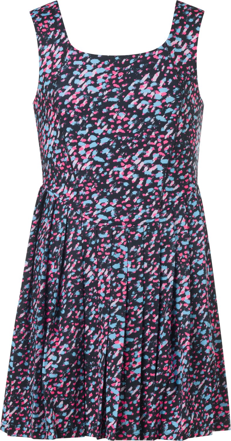 Have your little one looking their best when they wear the BCG Girls' Swing Pleated Print Cami Dress. It is made of 90% polyester and 10% elastane. The moisture wicking technology wicks away sweat to keep them dry, and its UPF 50+ rating helps protect from the sun's harsh rays. The sleeveless design keeps them cool.