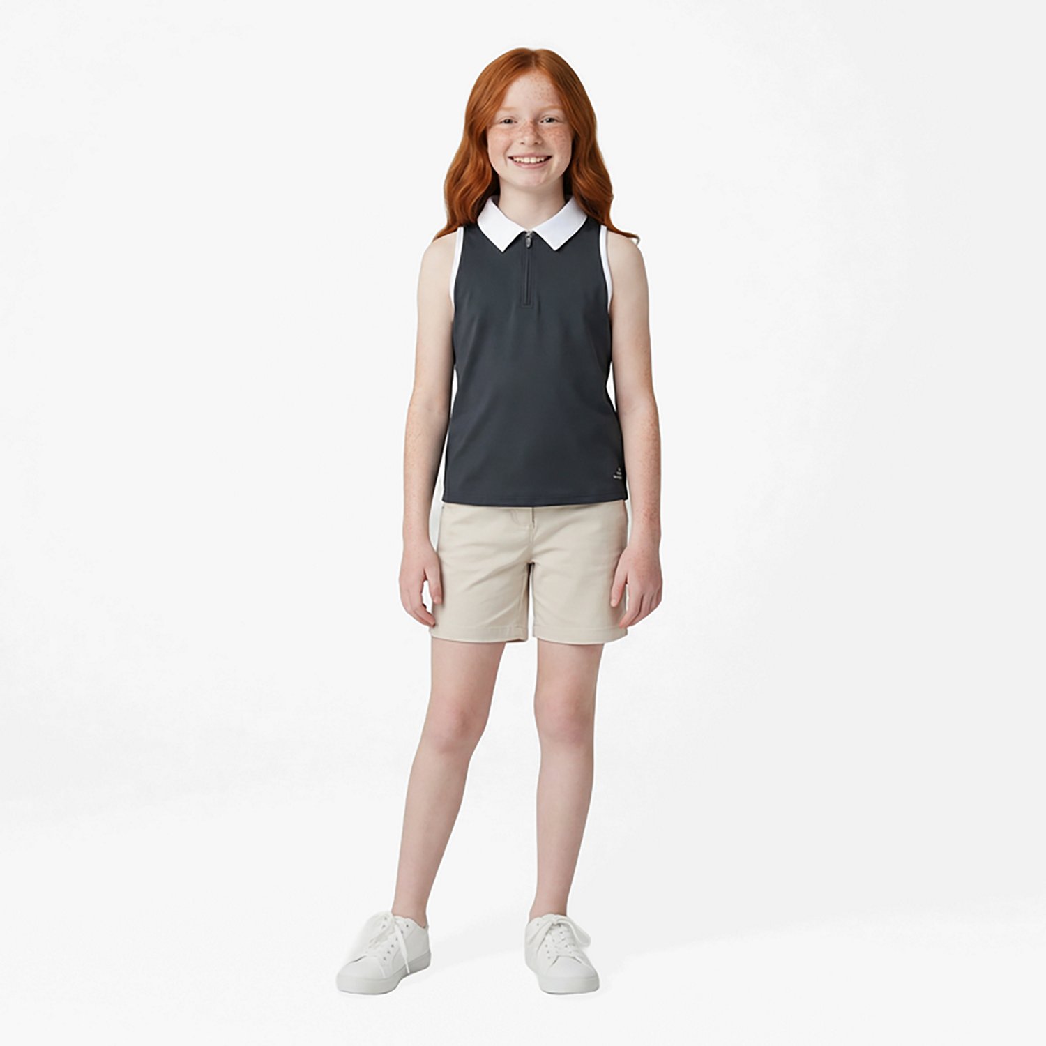 Young players will love donning the BCG Girls' Tennis Swing 1/4 Zip Sleeveless Polo Shirt and heading to the court. This polo is made of 86% recycled polyester and 14% spandex to offer a comfortable feel as you move, and the sleeveless design and performance fit allow great range of motion.