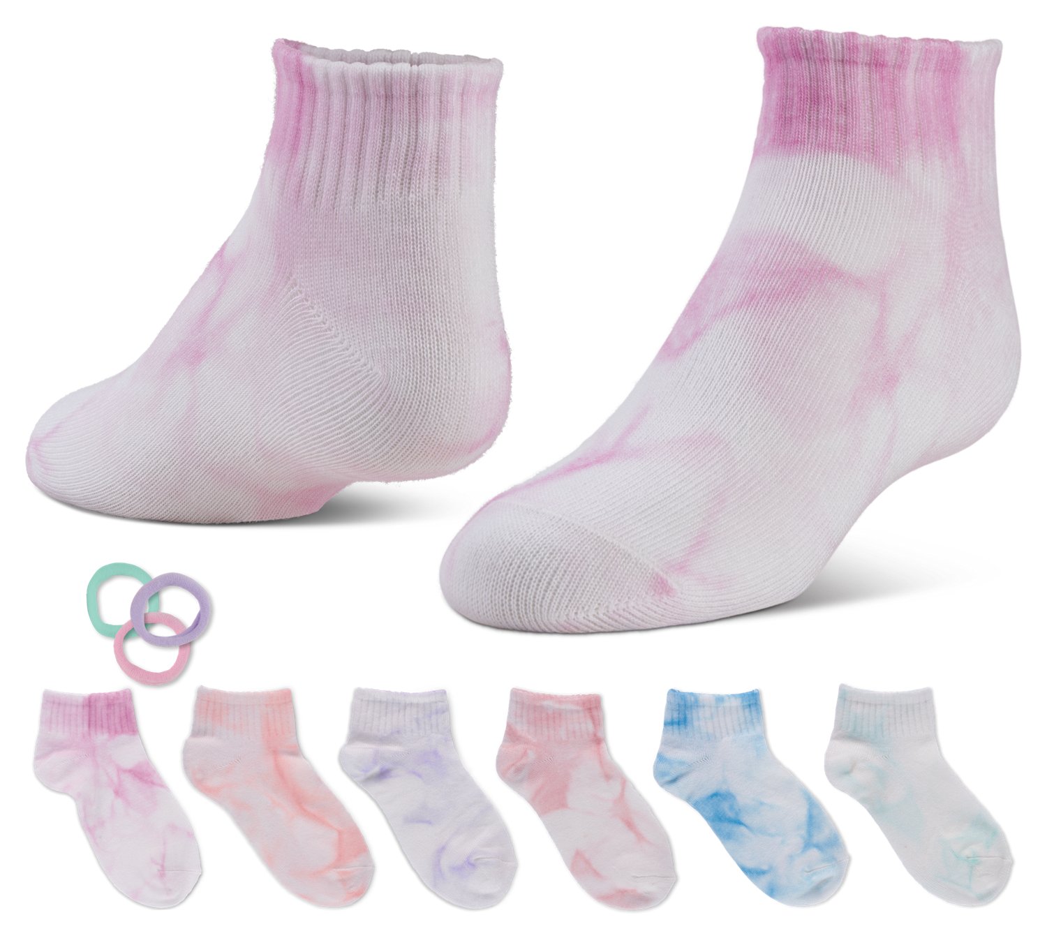 Improve your foot protection options with the BCG Girls' Tie Dye Hair Tie Ankle Socks 6-pack. The acrylic, polyester, and spandex sock material is built for frequent use, and the low cut design guards feet while keeping them relaxed. The polyester and spandex hair tie material is gentle, and the items in the set are made for casual settings.