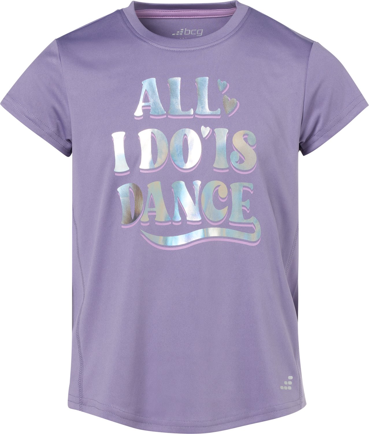 Sparkle and shine throughout the day with the BCG Girls' Training Turbo All Dance T-Shirt. This lightweight polyester tee gives you plenty of room to freely move, while the shiny foil wordmark shows off your love for dancing.