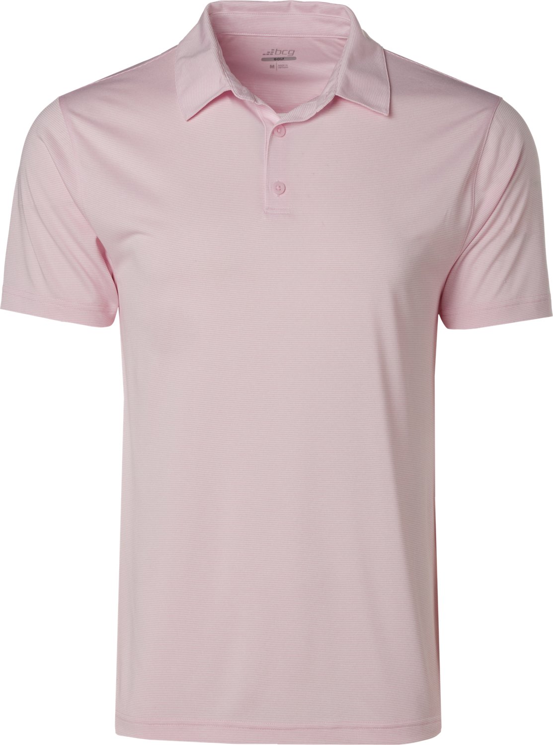 Look your best in the BCG Men's Golf Mini Stripe Short Sleeve Polo Shirt. It is made of 100% polyester. The moisture-wicking technology keeps you dry, and its collar neckline adds a layer of sophistication. The DTM clear buttons finish off the design.