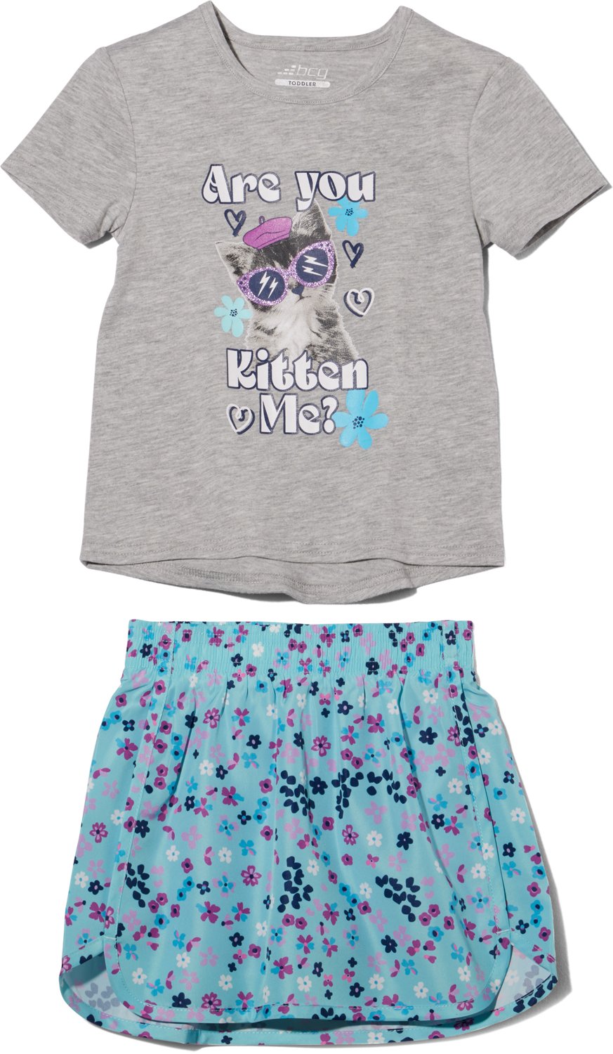 Have your little one looking their best in the BCG Toddler Girls' Kitten Floral Short Sleeve T-shirt Set. Its kitten graphic screen printed on the front. The floral pattern is all over the skort, and its inseam length varies by size. The crew neckline adds to the casual style.