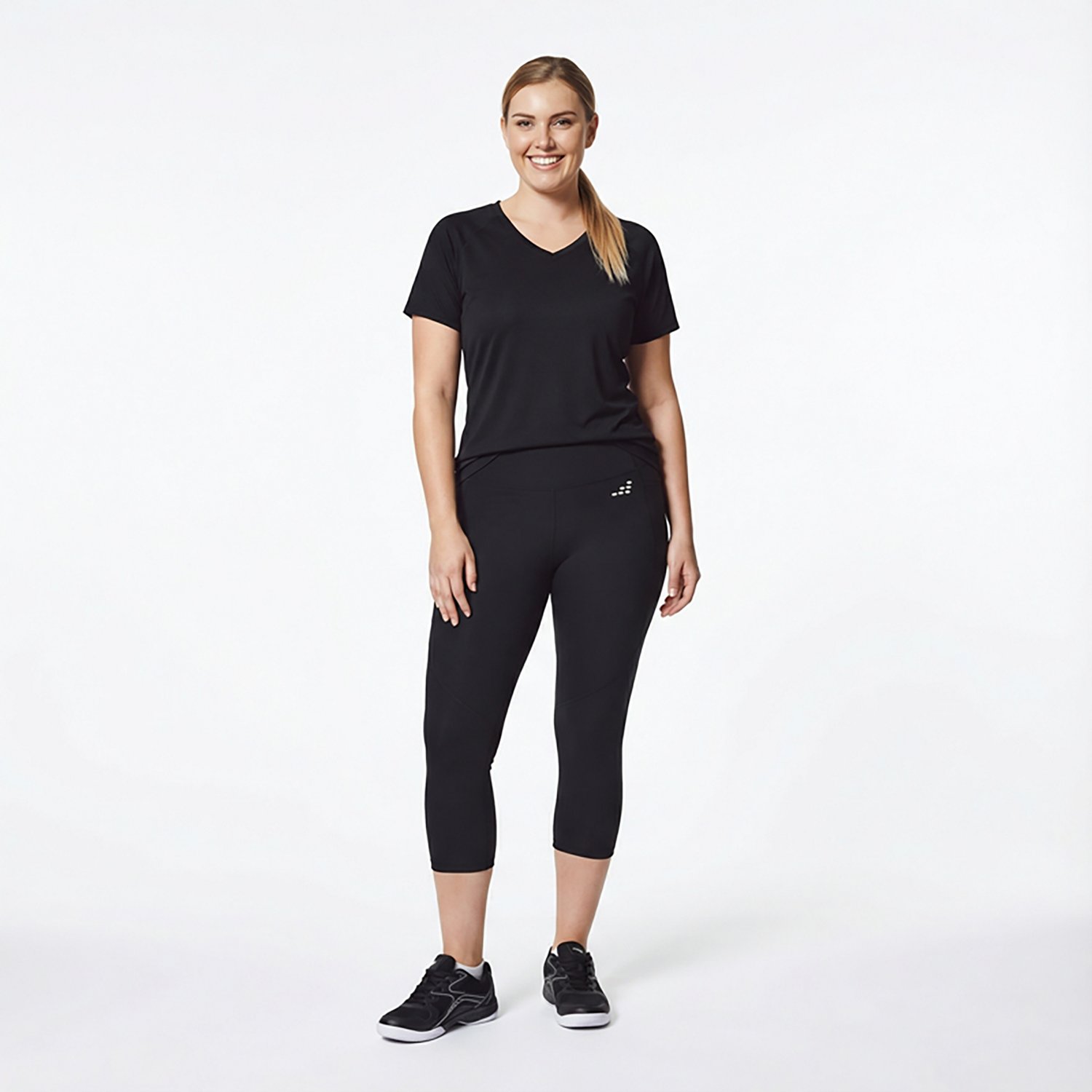 Look your best in the BCG Women's Color Block Crop Leggings. Their solid body knit is made of 77% recycled polyester and 23% spandex. The moisture-wicking technology keeps you dry, and their elastic waistband enhances comfort. The cropped length offers an athletic style.