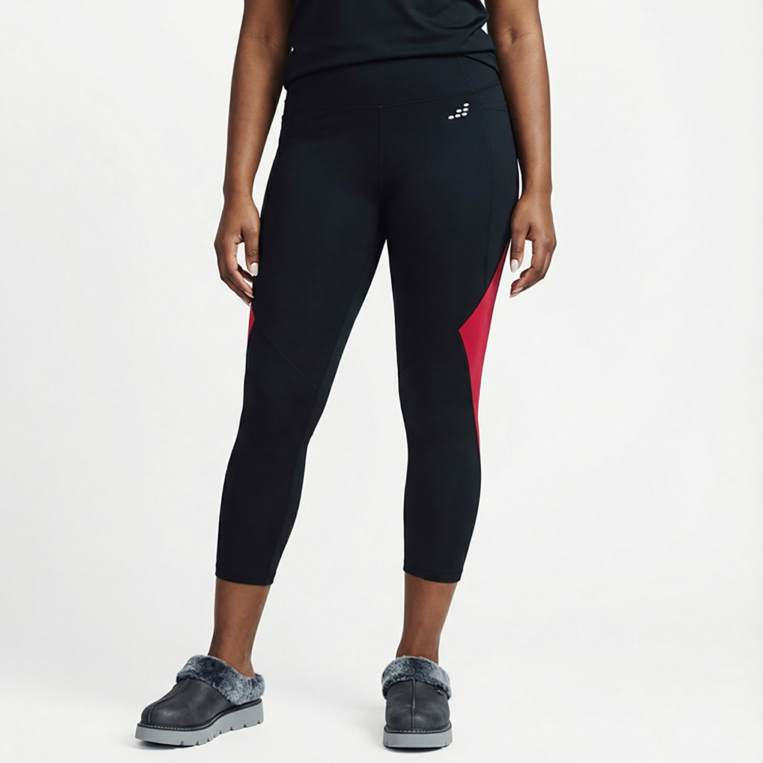 Look your best in the BCG Women's Color Block Crop Leggings. Their solid body knit is made of 77% recycled polyester and 23% spandex. The moisture-wicking technology keeps you dry, and their elastic waistband enhances comfort. The cropped length offers an athletic style.