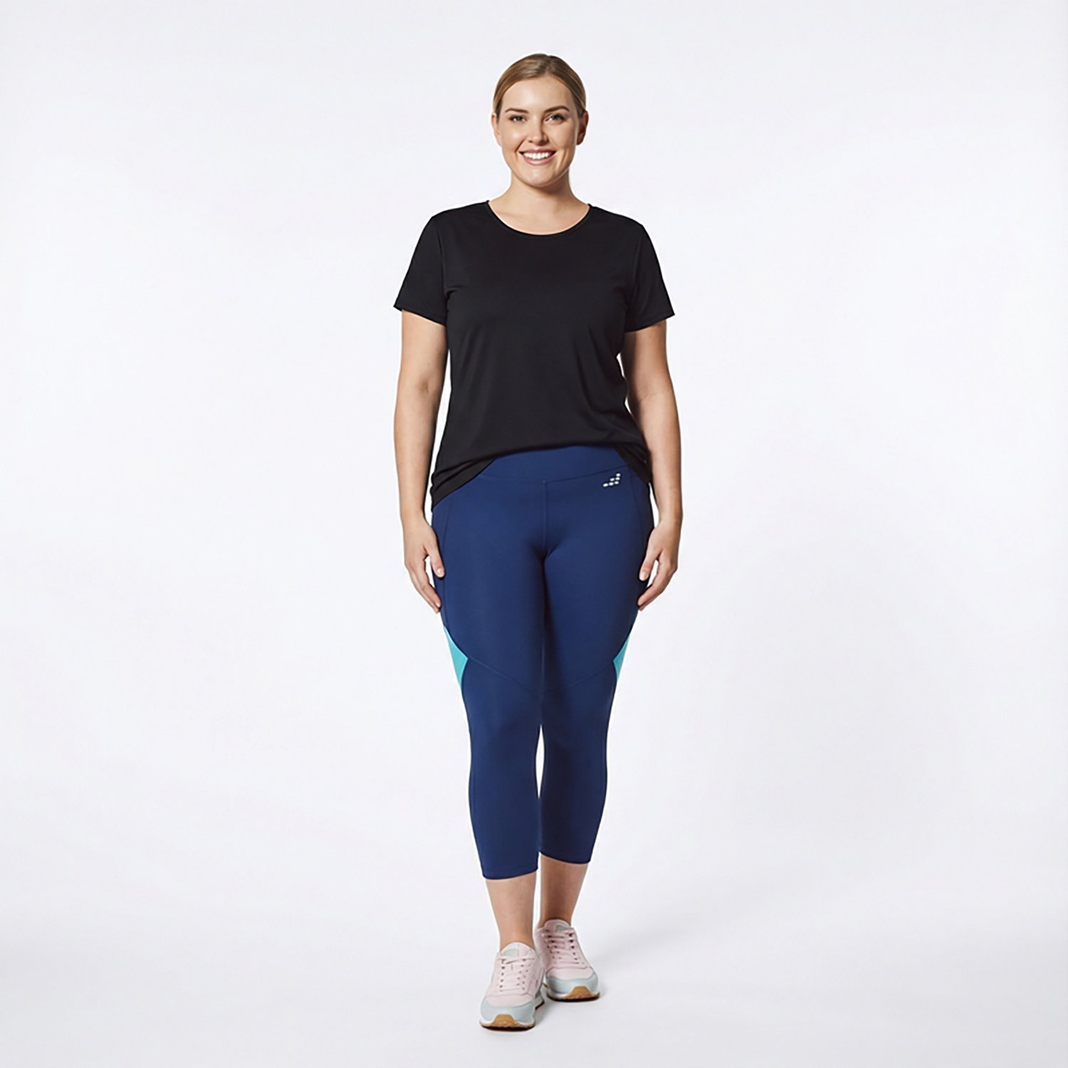 Look your best in the BCG Women's Color Block Crop Leggings. Their solid body knit is made of 77% recycled polyester and 23% spandex. The moisture-wicking technology keeps you dry, and their elastic waistband enhances comfort. The cropped length offers an athletic style.